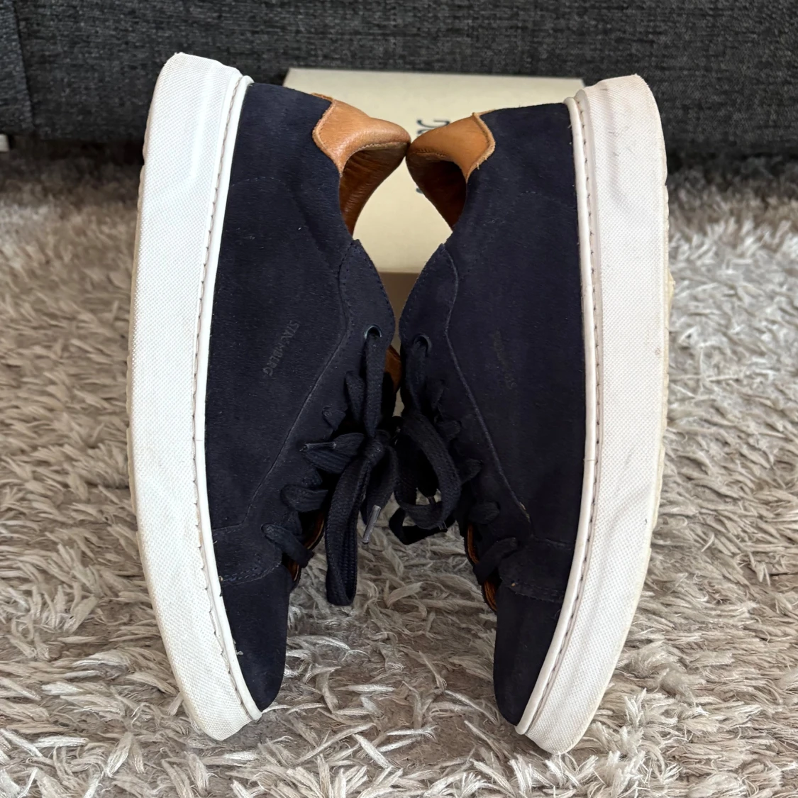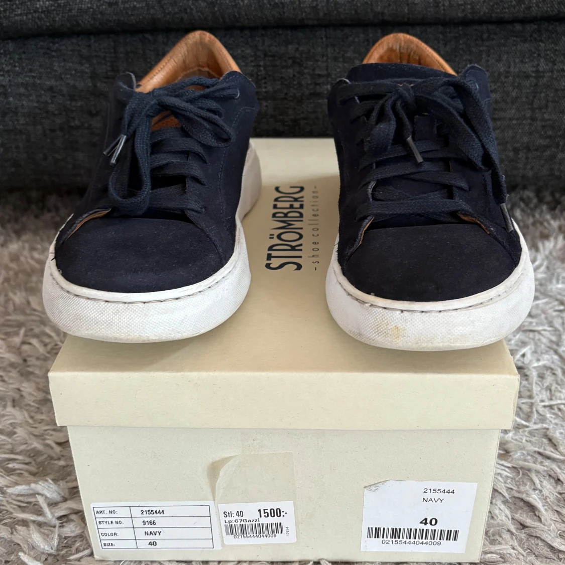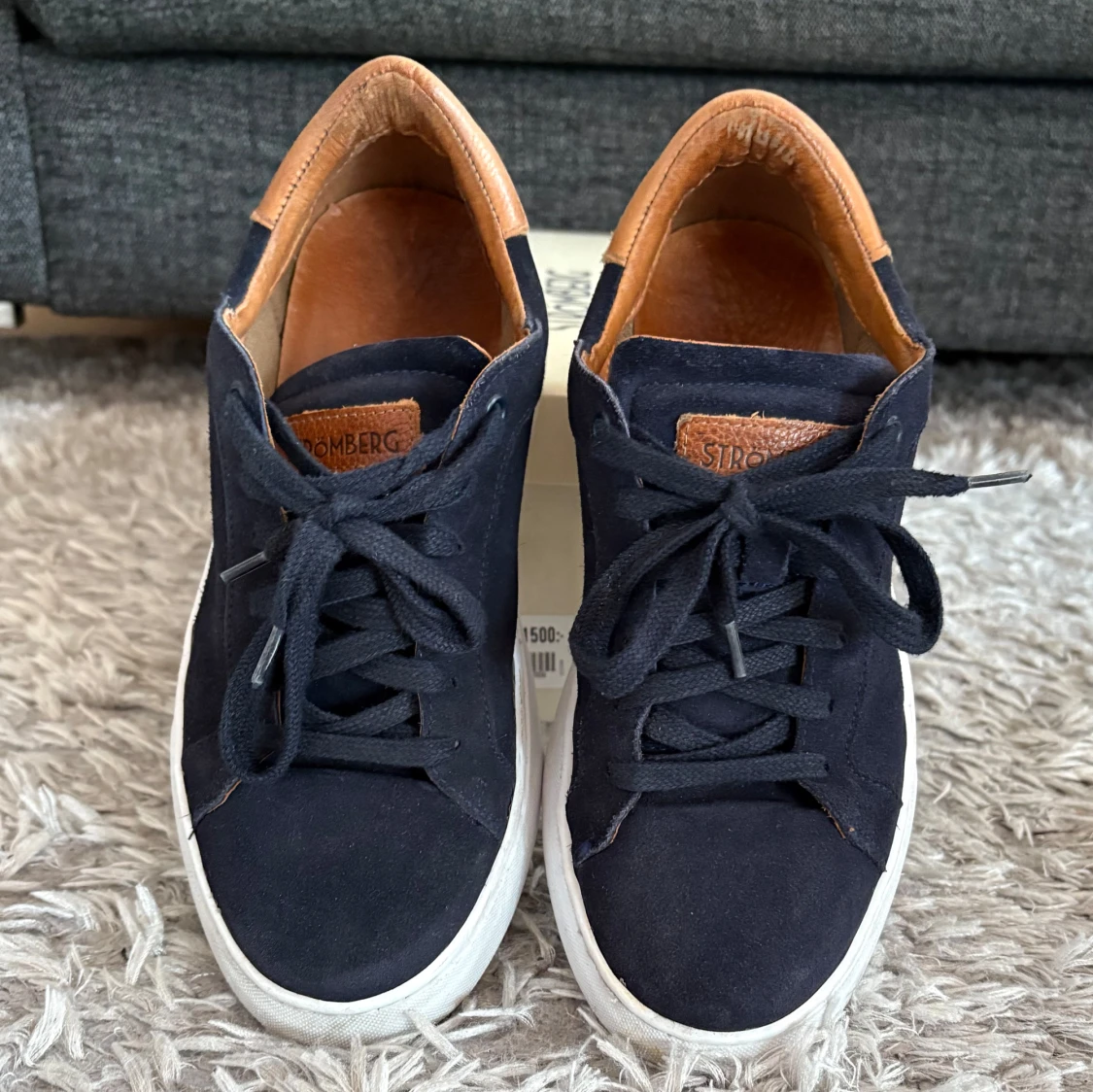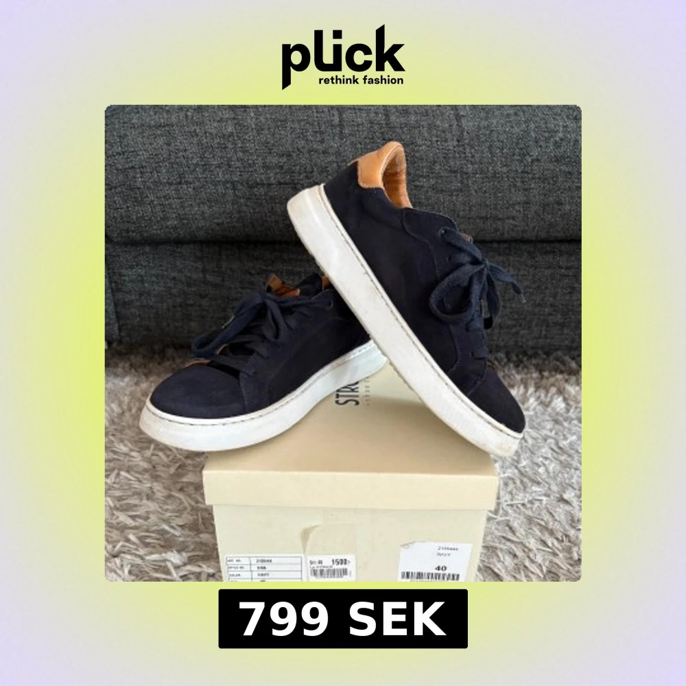 Snygga blå mocka sneakers i nästintill nyskick från Strömberg med vita sulor och bruna detaljer vid häl och plös. Skorna har snörning och är tillverkade i mocka för en stilren look. Perfekta för skolavslutningen och om man vill ha lite extra stil i vardagen. Nypris 1 500 kr
