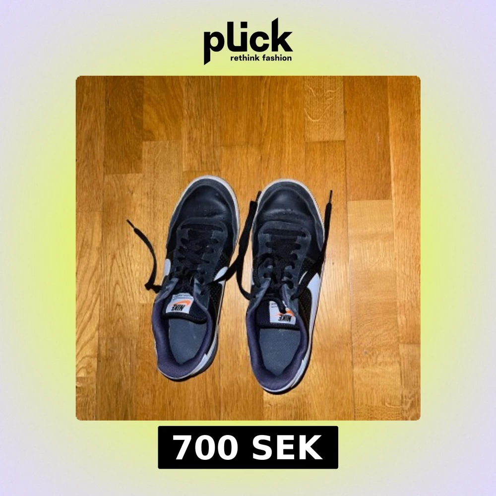 Säljer ett par svarta Nike sneakers med vit swoosh och svart snörning. Skorna har en klassisk låg profil och är tillverkade i skinn och syntetmaterial. Insidan är fodrad i grått tyg och sulan är vit. Perfekta för dig som gillar stilrena och sportiga skor.
