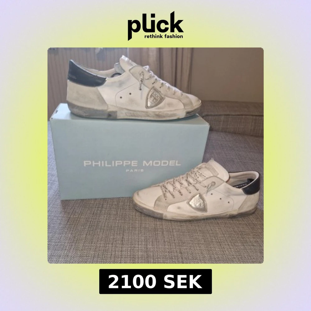 Säljer ett par vita Philippe Model sneakers i skinn med grå och svarta detaljer. Skorna har snörning med logotyp på skosnörena och en silverfärgad sköld på sidan. Klassisk låg modell med rund tå och platt sula. Tillverkade i Italien.
