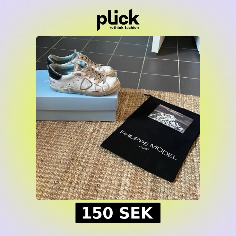 Säljer ett par vita Philippe Model sneakers med grå detaljer och svarta hälpartier. Skorna har snörning och en klassisk låg profil med rund tå. Perfekta för dig som gillar stilrena och trendiga sneakers.