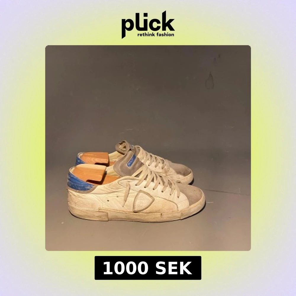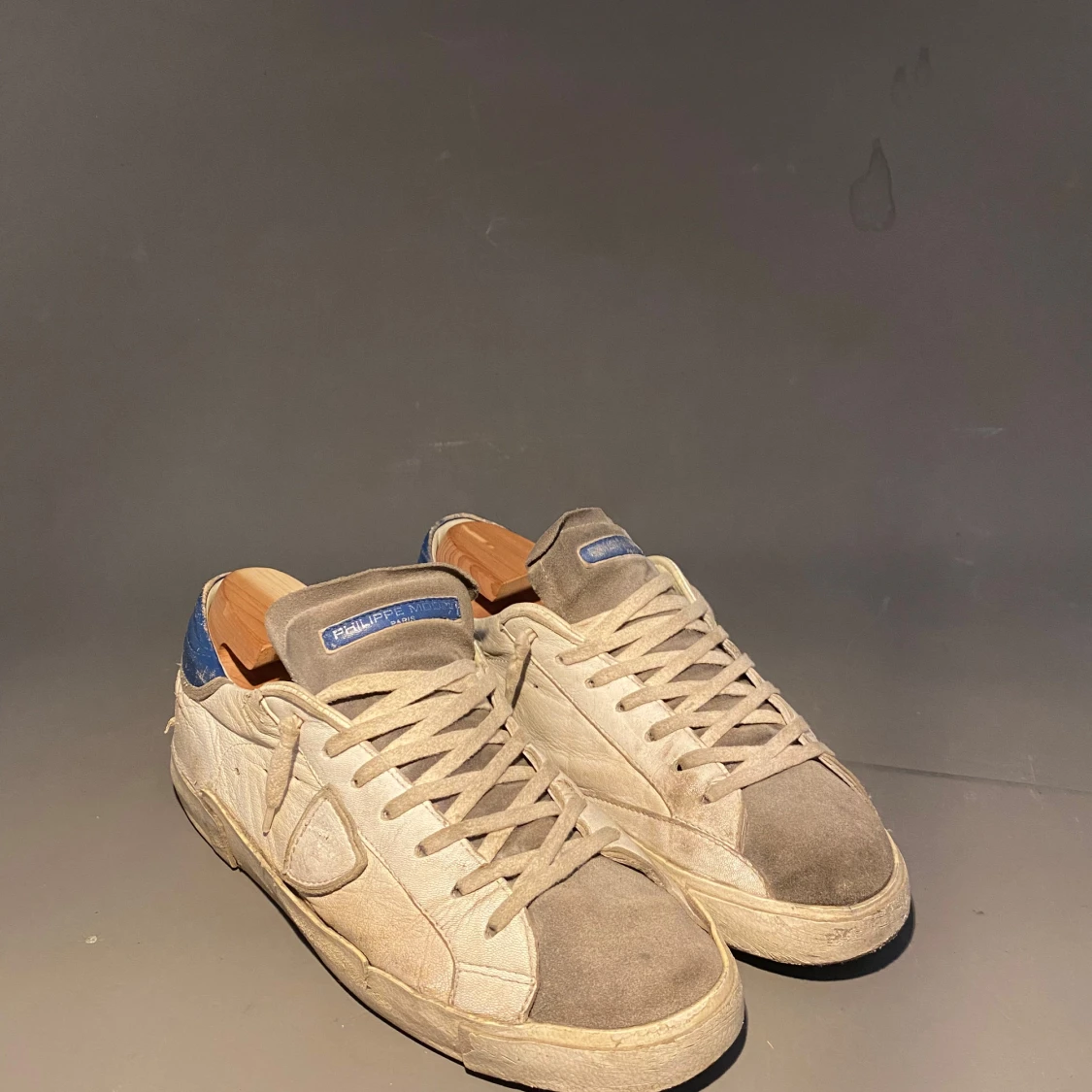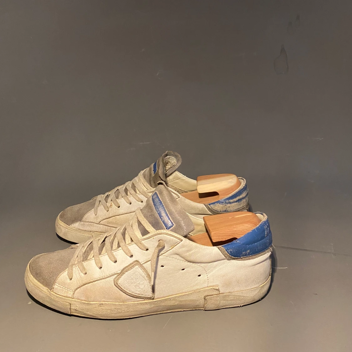 Sneakers från Philippe Model i beige mocka och skinn med blå detaljer på hälen. Klassisk låg modell med rund tå, snörning och platt sula. Märkeslogga på sidan och tungan. Perfekta för en avslappnad och trendig look.