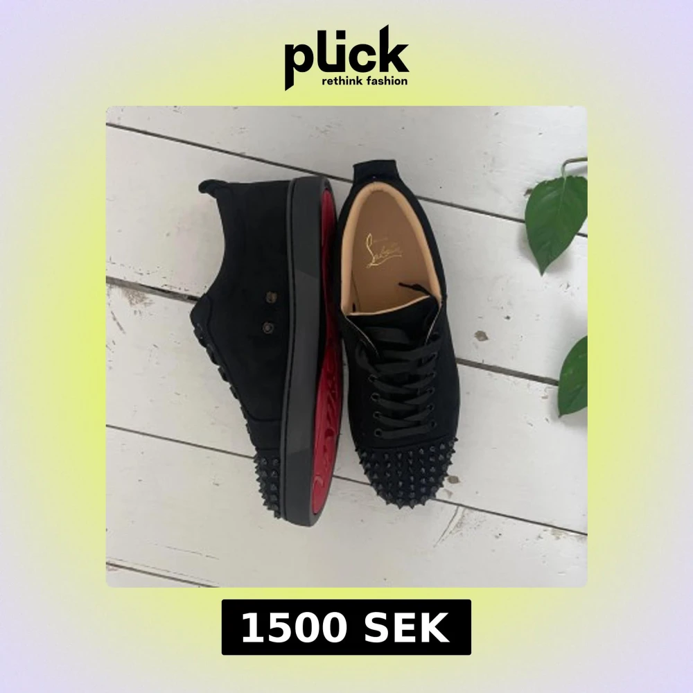 Svarta sneakers från Christian Louboutin i mocka med ikonisk röd sula och svarta nitar på tån. Skorna har snörning och rund tå, samt exklusiv känsla med märkets logga på innersulan. Perfekta för dig som vill sticka ut med en edgy och lyxig stil.