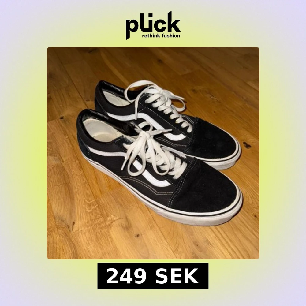 Säljer ett par klassiska svarta och vita Vans sneakers med snörning. Skorna har en vit sula och den ikoniska vågiga sidodetaljen i vitt. Perfekta för en avslappnad stil. Mycket bra skick! Storlek 44