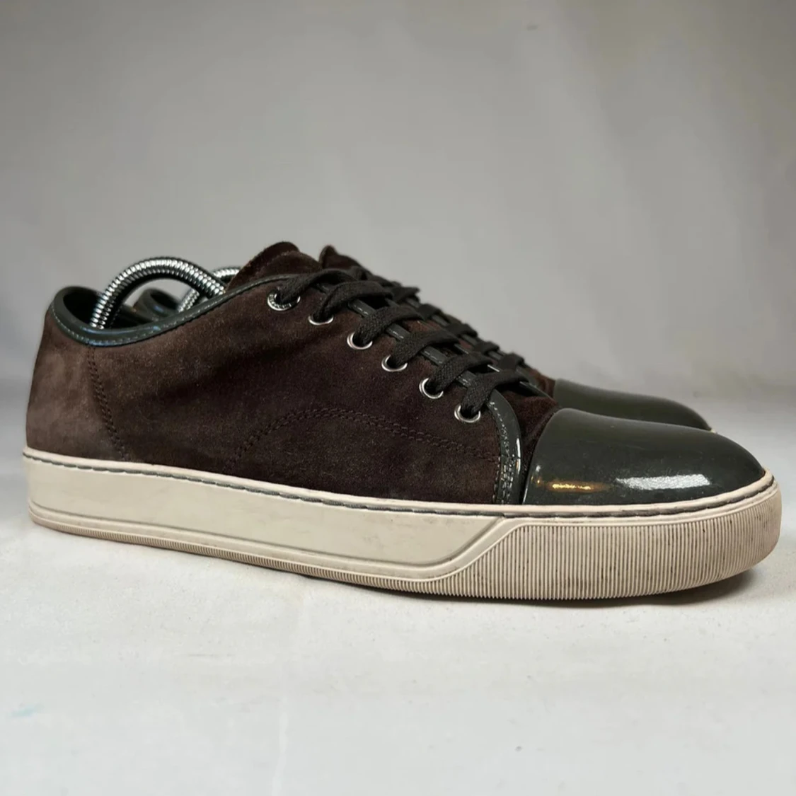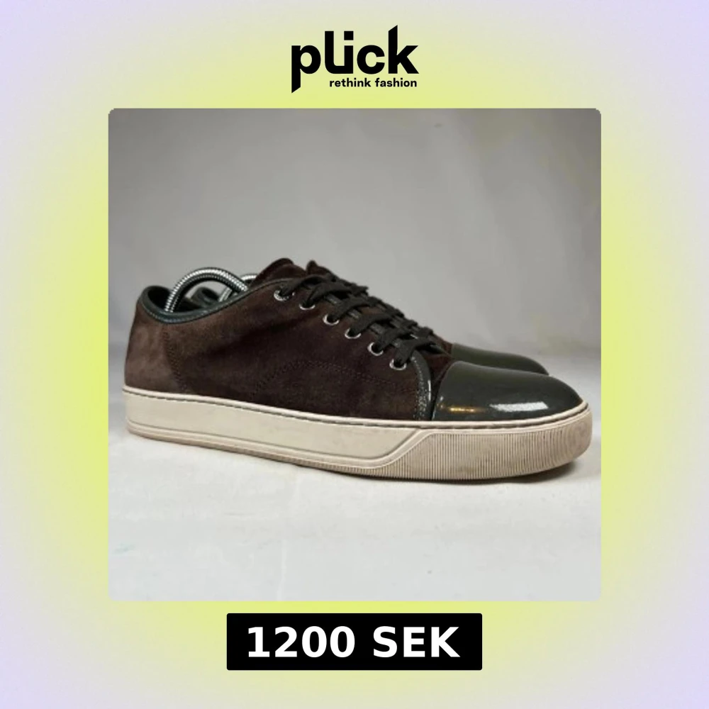 Snygga bruna sneakers i mocka med mörkgrå lackad tå och matchande snörning. Skorna har en vit platt sula och rund tå, vilket ger en clean och modern look. Perfekta för dig som gillar stilrena detaljer och kontrasterande material.