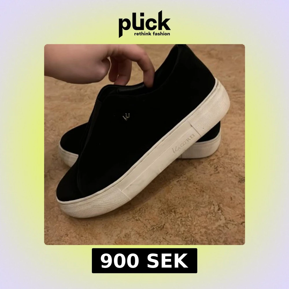 Svarta sneakers med tjock vit platt sula. Ovandelen är i mocka och har en stilren look utan synlig snörning. Använda 1 gång för att dom va för små för mig. Dom är som nya och köpta för 1.300