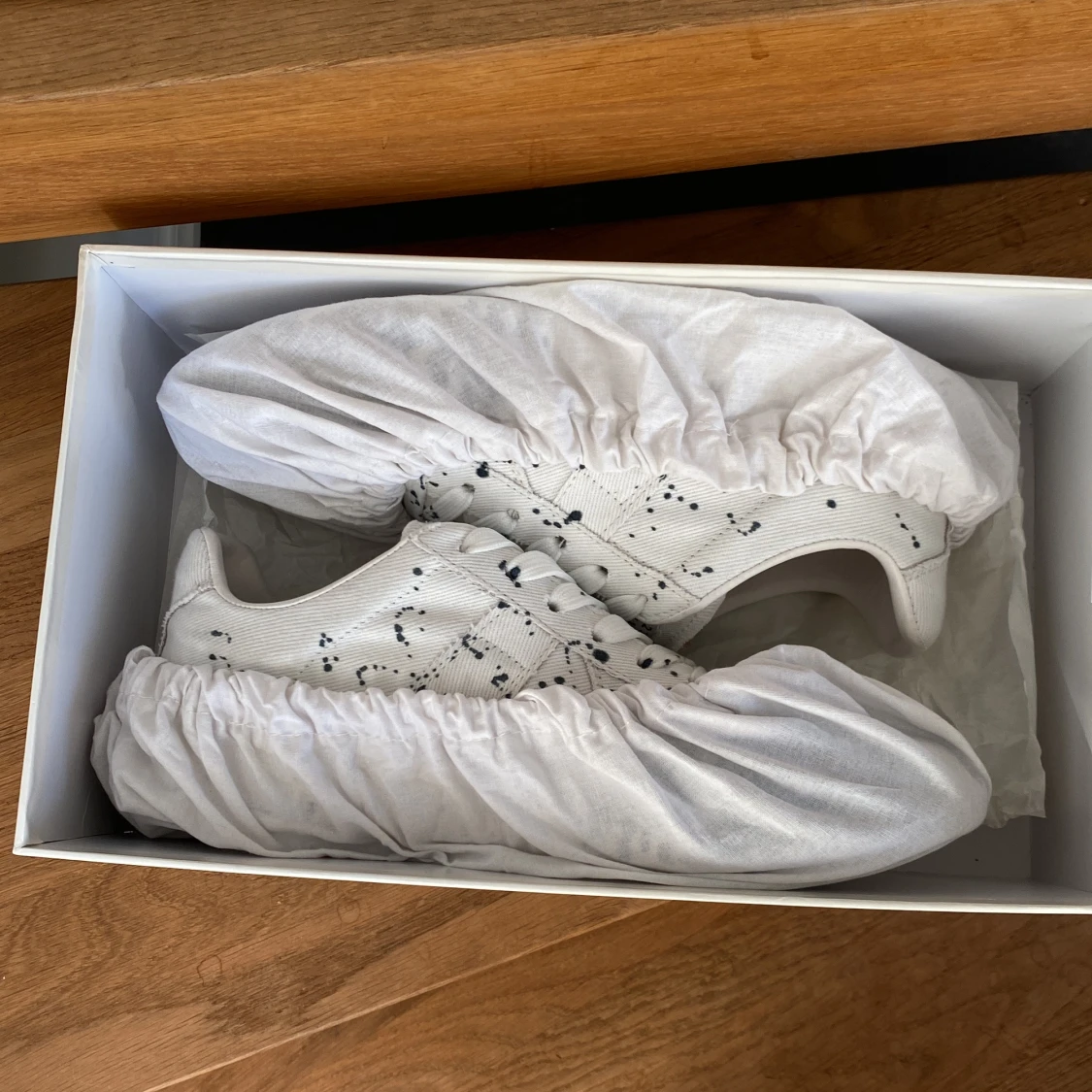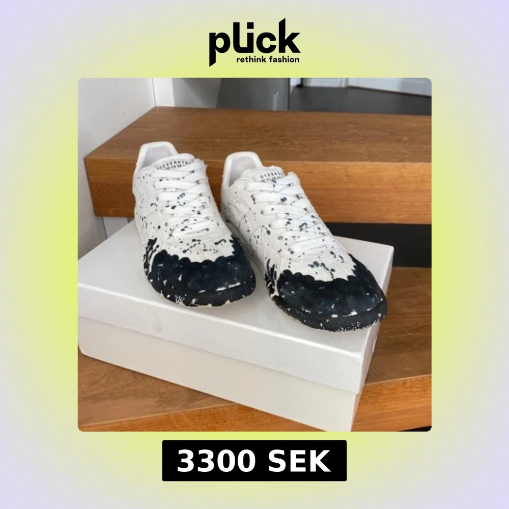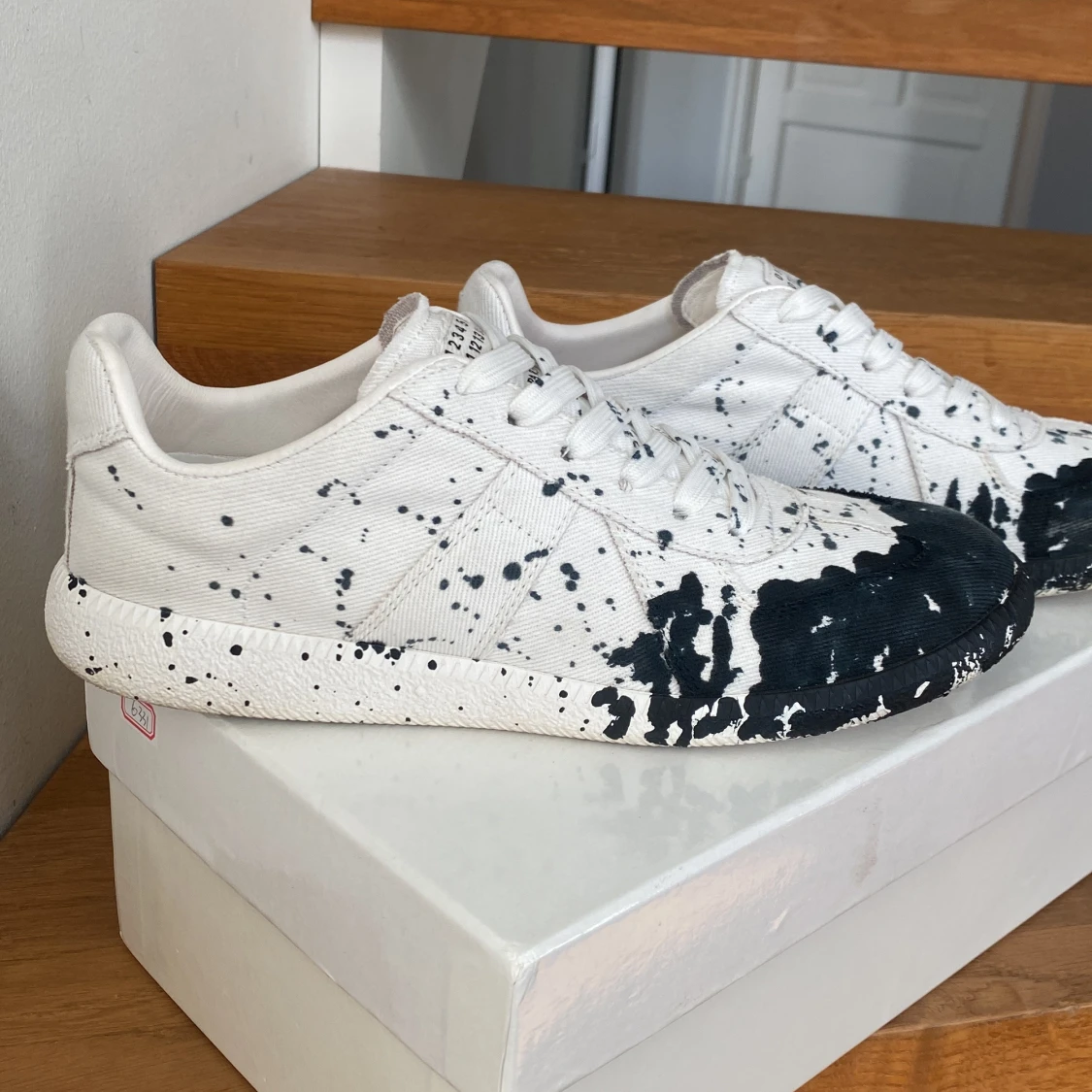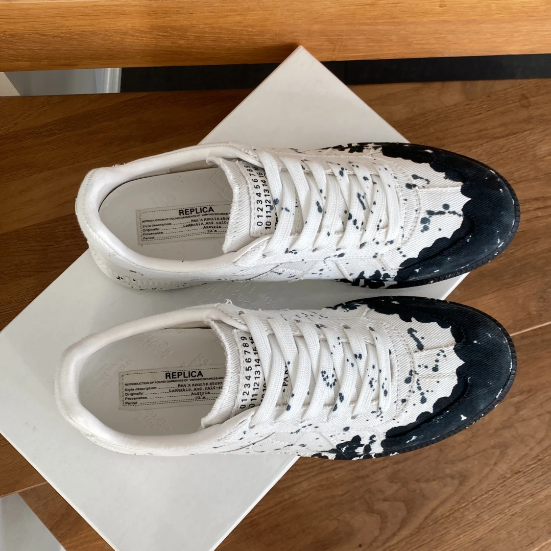 Maison Margiela sneakers i vitt tyg med svart färgstänk och unikt mönster. Perfekt för dig som vill klä upp dig i vardagen🌟 Hör gärna av dig vid intresse och du är välkommen att ställa frågor🤗 Fler bilder kan skickas✅