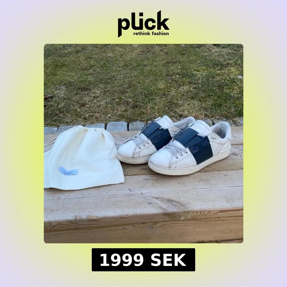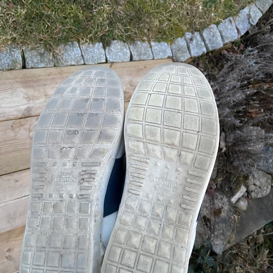 Snygga vita sneakers från Valentino med en bred blå rem över snörningen. Skorna har en klassisk rund tå och en robust sula. Perfekta för en stilren look.