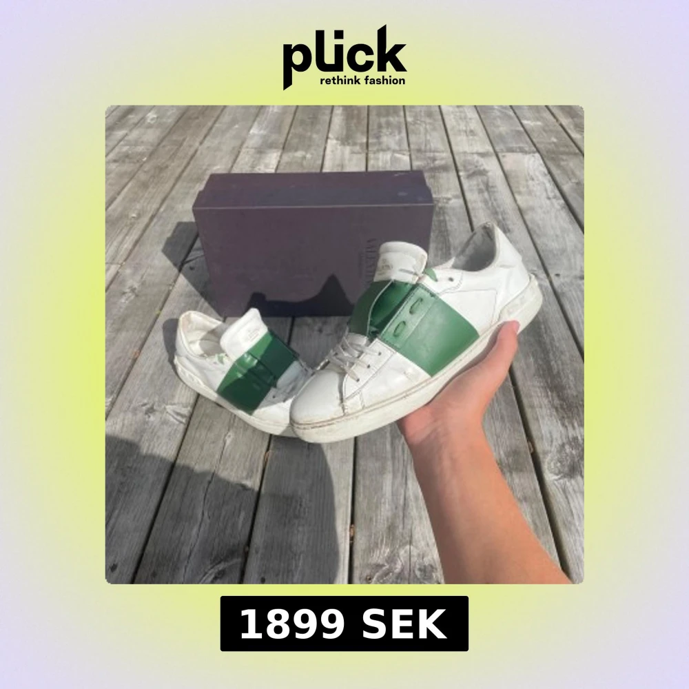 Snygga Valentino Garavani Open sneakers i vitt skinn med en bred grön läderdetalj över mitten. Klassisk rund tå, vita snören och diskret logga på plösen. Platt sula med nitar baktill ger en cool touch. Perfekta för dig som gillar statement-sneakers. Ny pris är 5500kr och kvitto finns ifall det behövs för att visa att de är äkta!