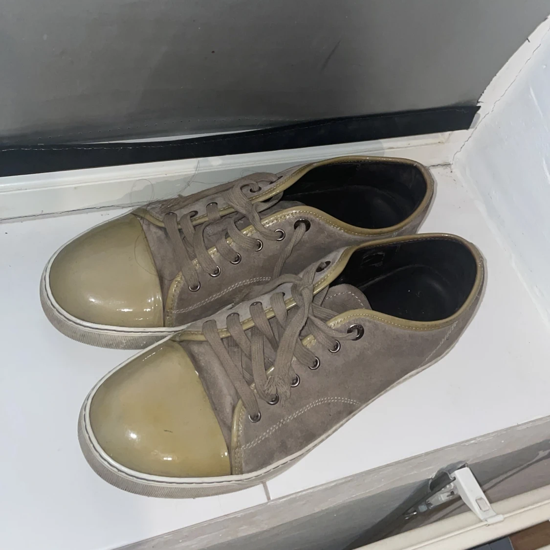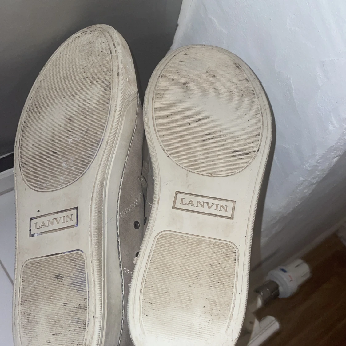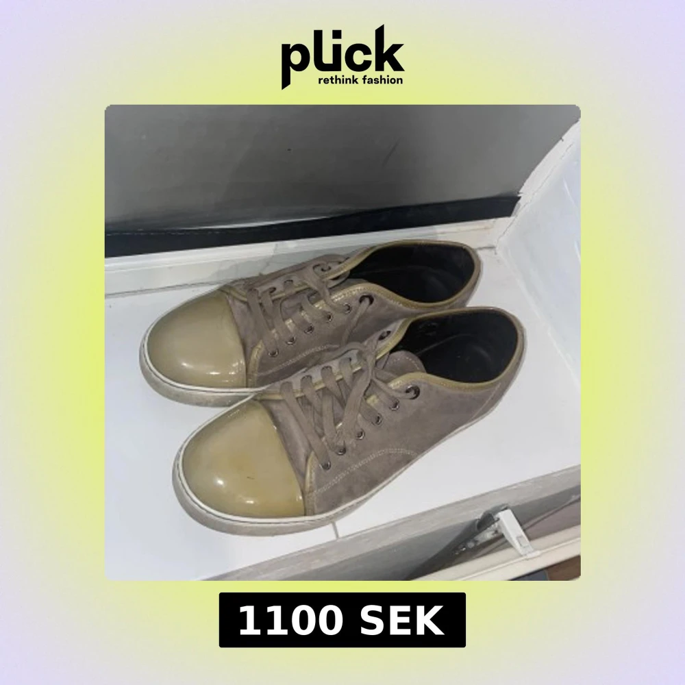 Säljer ett par grå sneakers från Lanvin med beige glans i storlek 43 (är dock som 44) har haft dom har i nårgra månader men inte kommit till användan. Obs snörrena är trasiga