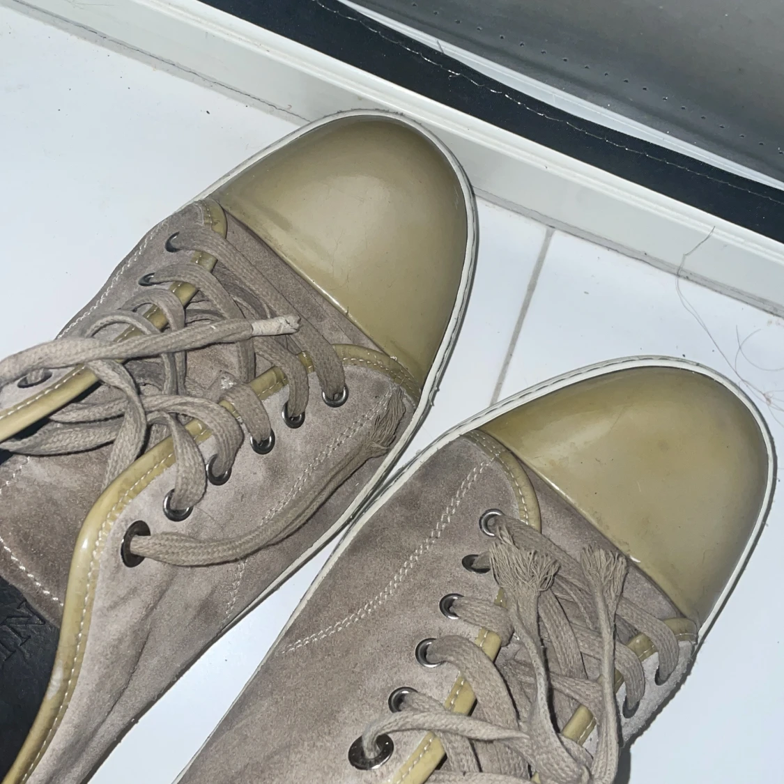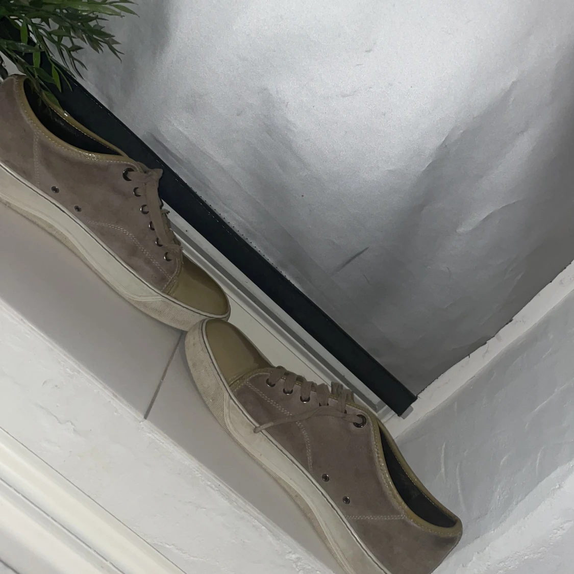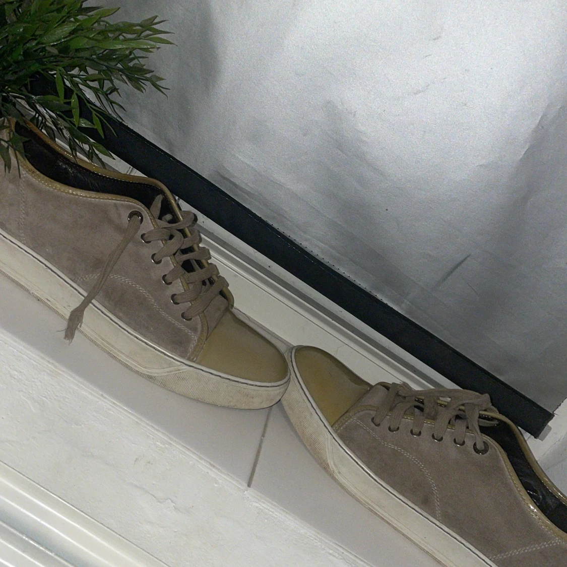 Säljer ett par grå sneakers från Lanvin med beige glans i storlek 43 (är dock som 44) har haft dom har i nårgra månader men inte kommit till användan. Obs snörrena är trasiga