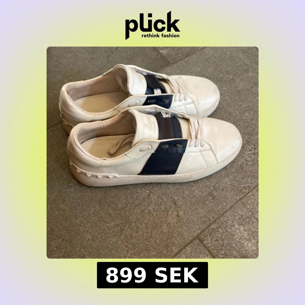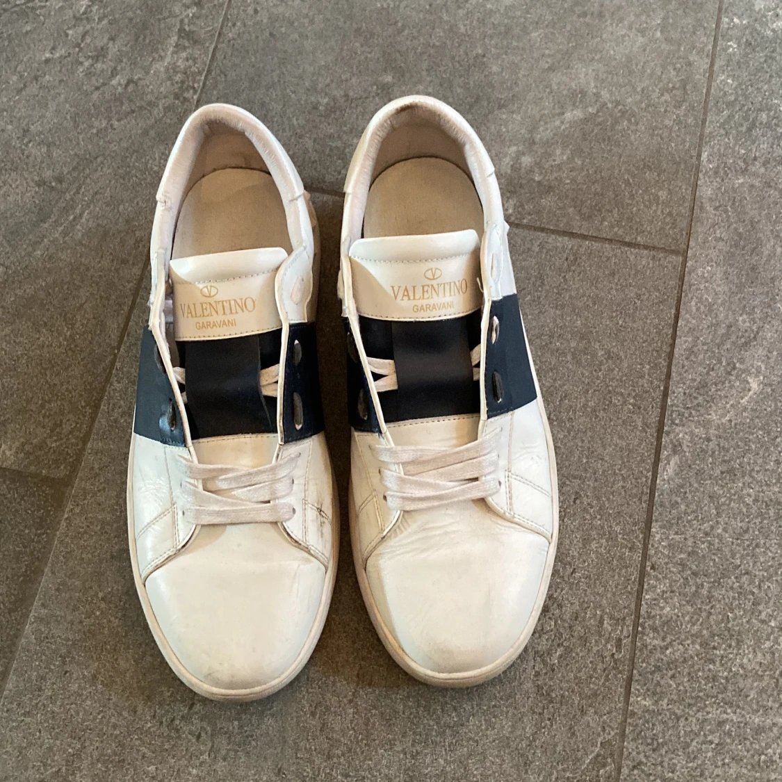 Snygga vita Valentino Garavani sneakers med bred mörkblå rem över vristen och klassisk snörning. Skorna har rund tå och platt sula, tillverkade i skinn med diskret logga på plösen och innersulan. Perfekt för dig som gillar stilrena designer med en twist.