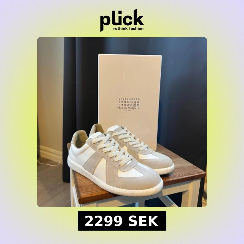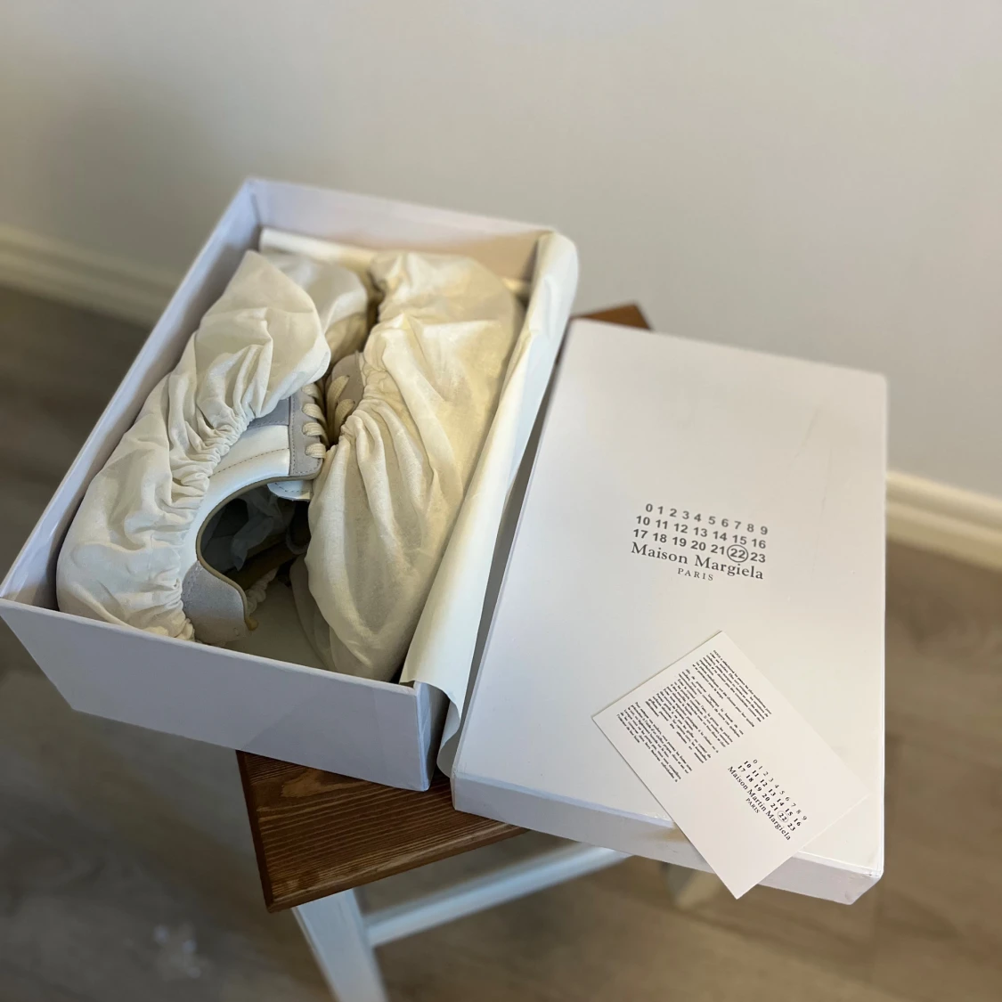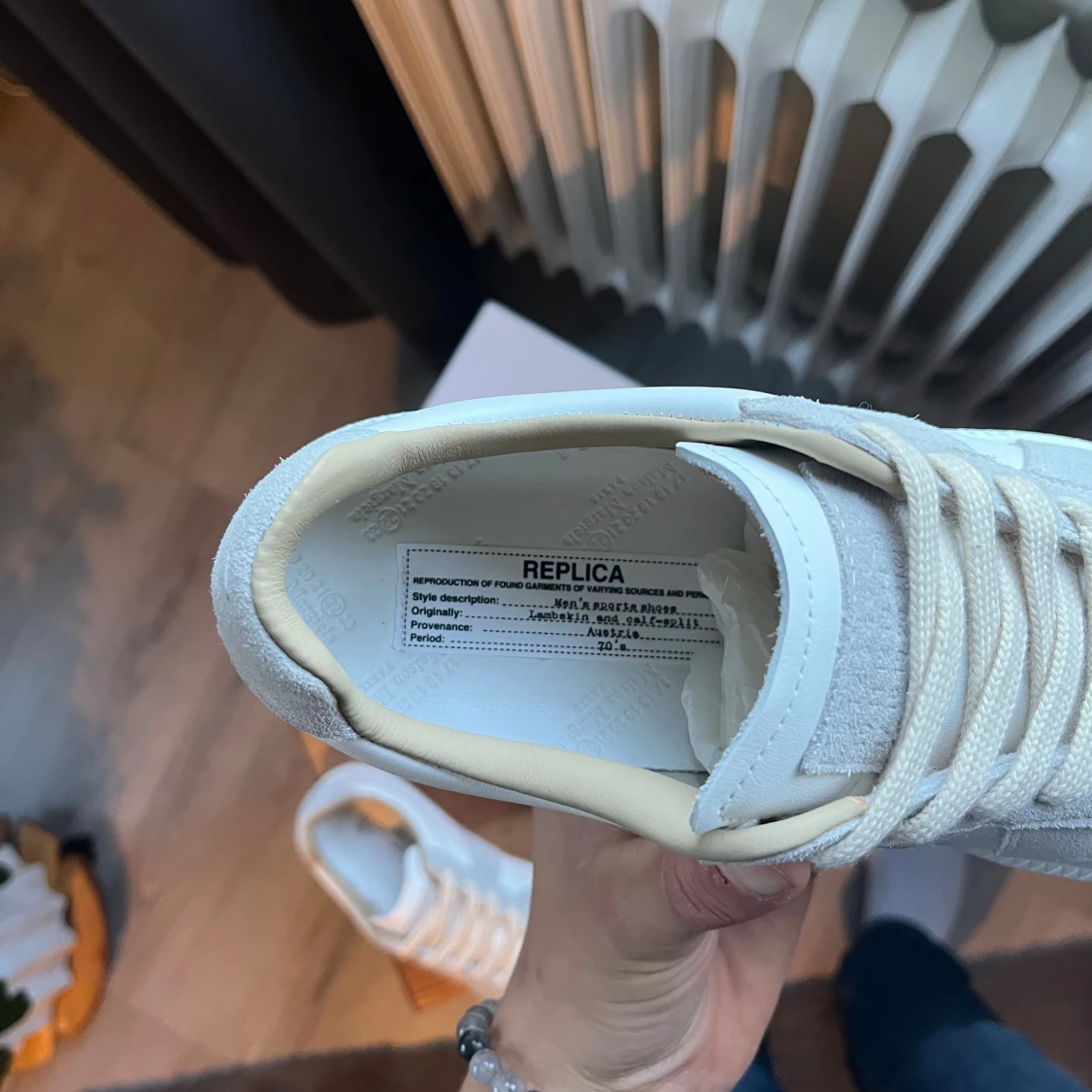 Maison Margiela sneakers i vitt och beige med snygga paneler i mocka och skinn. Klassisk rund tå, platt sula och beige snörning. Säljer dom eftersom de finns inget bevis att skorna är äkta och är fortfarande ösäker, 🔥PRIS OCH ANNAT KAN ALLTID DISKUTERAS 🔥