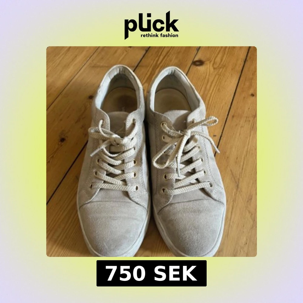Säljer ett par snygga beige sneakers från Vagabond med ovandel i mocka och vita snören. Skorna har guldfärgade öljetter och en platt vit sula. Perfekta för dig som gillar stilrena och klassiska sneakers.