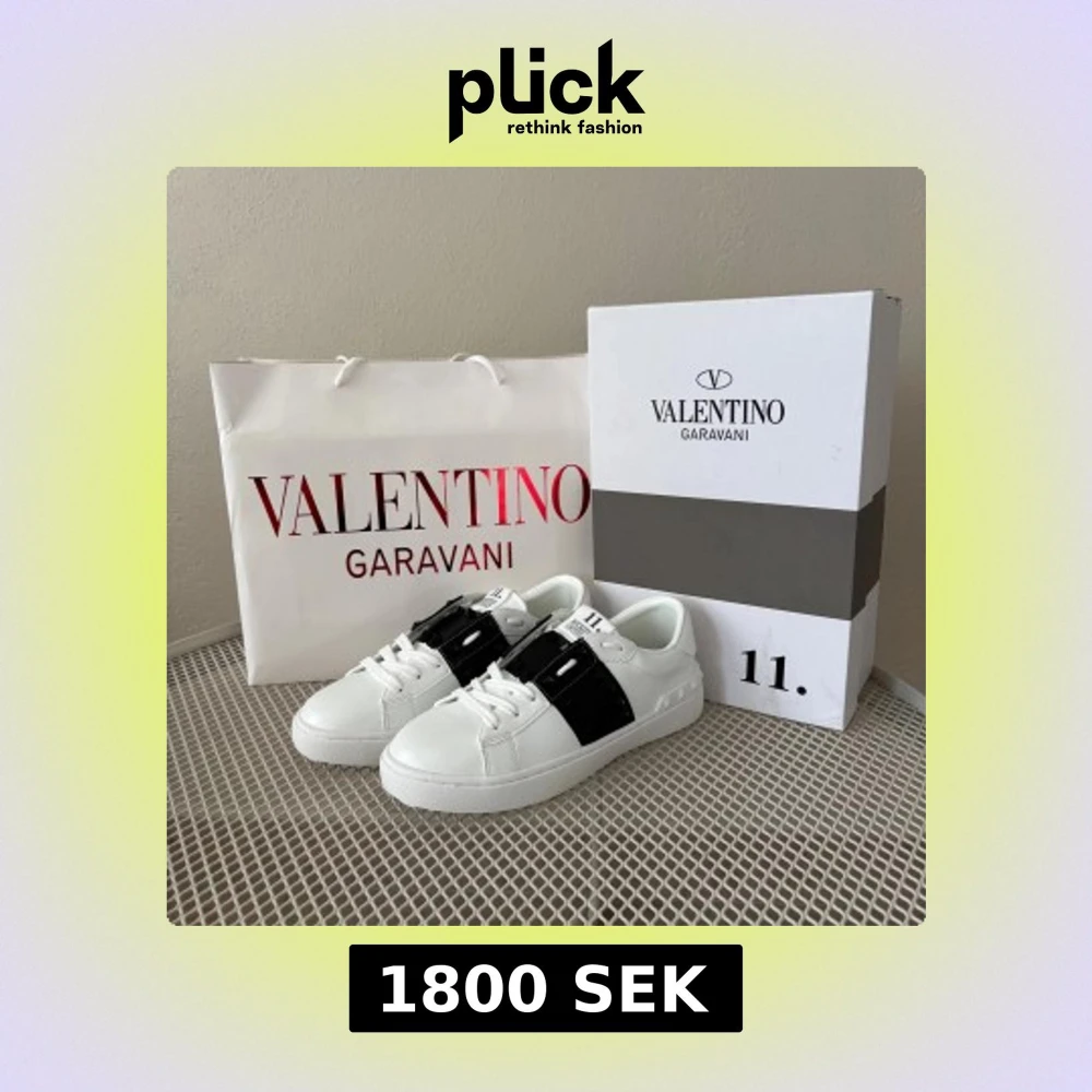 Säljer ett par snygga och HELT NYA Valentino Garavani Rockstud sneakers i vitt skinn med svart band och ikoniska pyramidnitar. Skorna har rund tå, platt sula med mönster och vita snören. Stl 37-38 Helt nya! Perfekt för dig som vill sticka ut med lyxig streetstyle. 100% äkta Andvända ca en vecka efter annonsen uppladdades