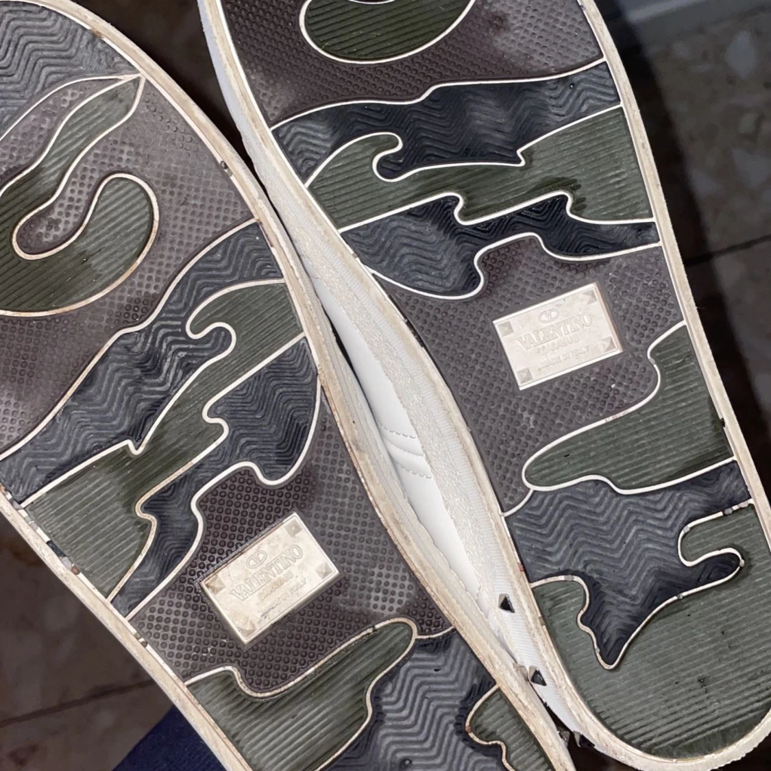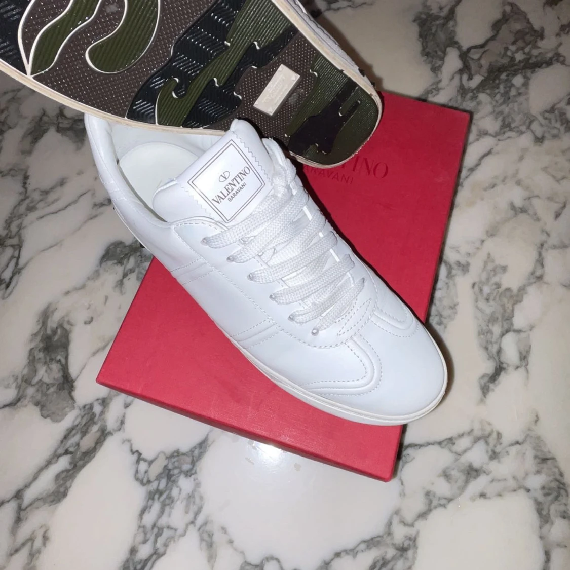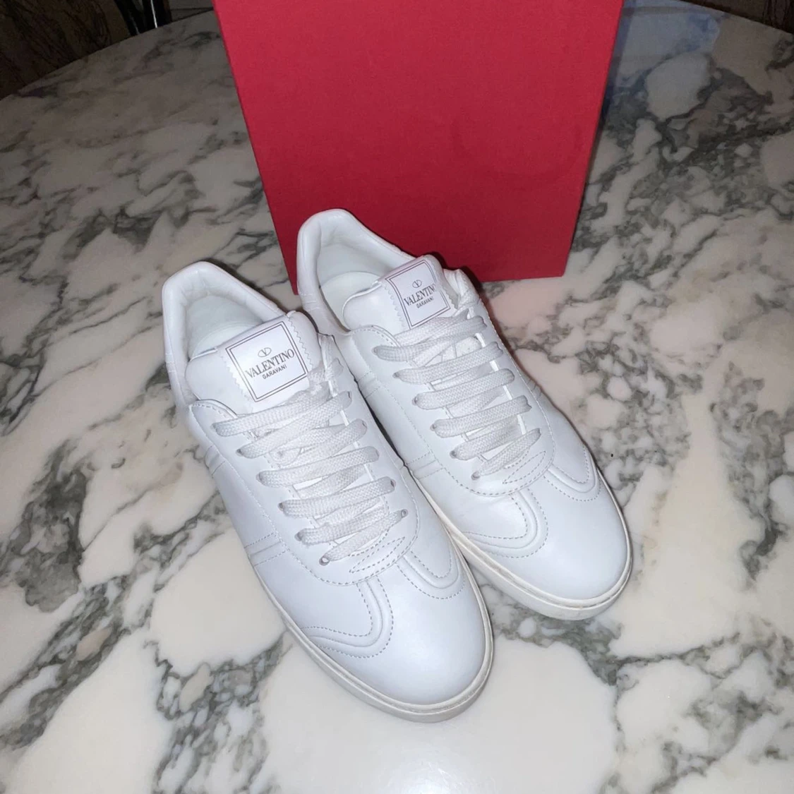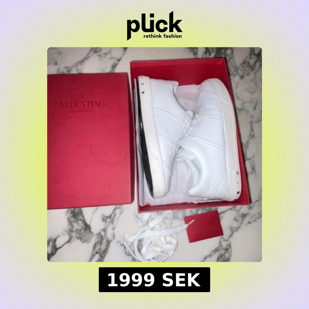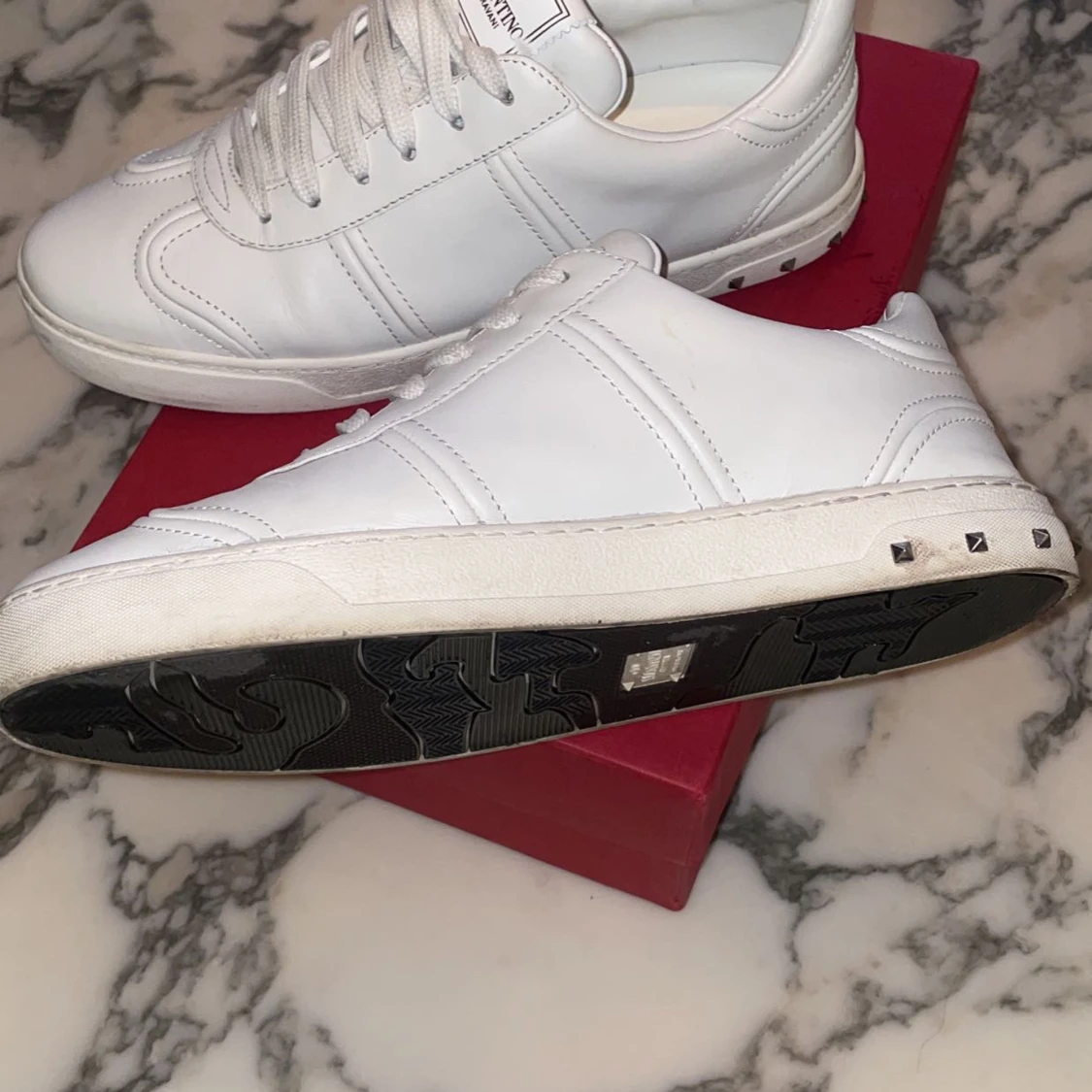 Snygga vita sneakers från Valentino Garavani i skinn med klassisk låg siluett och coola nitar på hälen. Skick 9/10, storlek 40, sitter extremt bra, fraktar direkt, 1 nitt borta men inget mer, inga defekter, tveka inte på att höra av er!