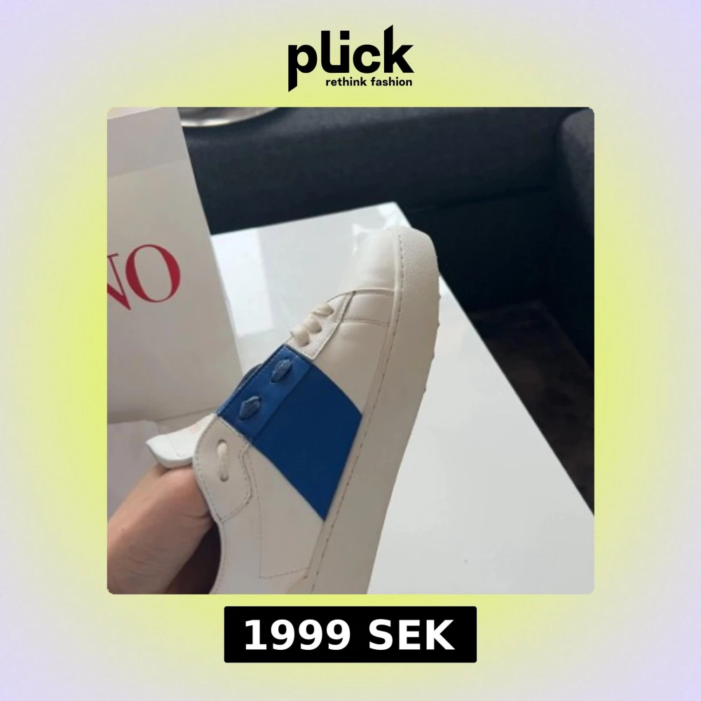 Säljer ett par vita Valentino sneakers med en bred blå remsa på sidan och vita snören. Skorna har rund tå och platt sula. Klassisk och stilren design med diskret Valentino-logga på plösen.