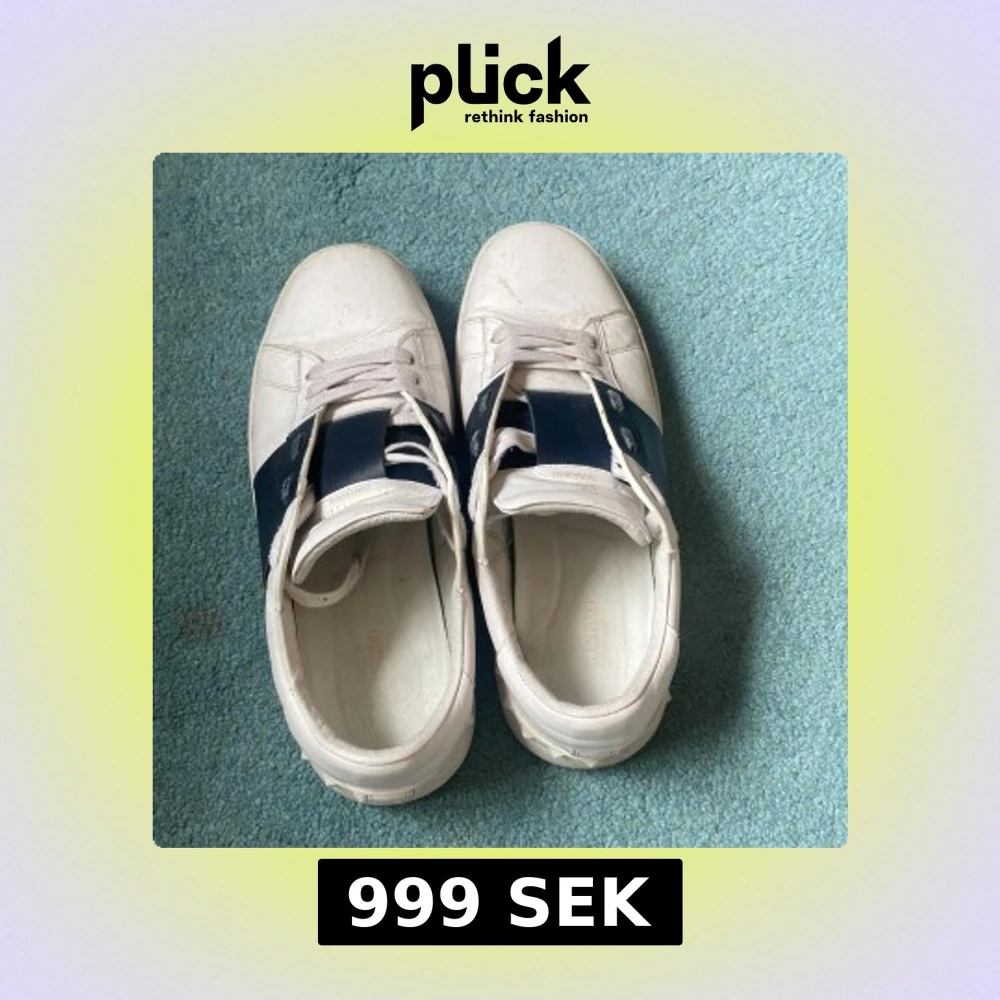 Snygga vita sneakers från Valentino Garavani med bred mörkblå läderdetalj över vristen och ikoniska nitar på hälen. Skorna har snörning, rund tå och platt sula. Tillverkade i skinn för en lyxig känsla och stilren look.