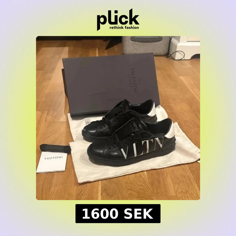 Säljer ett par svarta Valentino Garavani sneakers med vit VLTN-logga på sidan och vit häl. Skorna har snörning och platt sula, och är tillverkade i skinn. Kommer med originalkartong och dustbag och kvitto