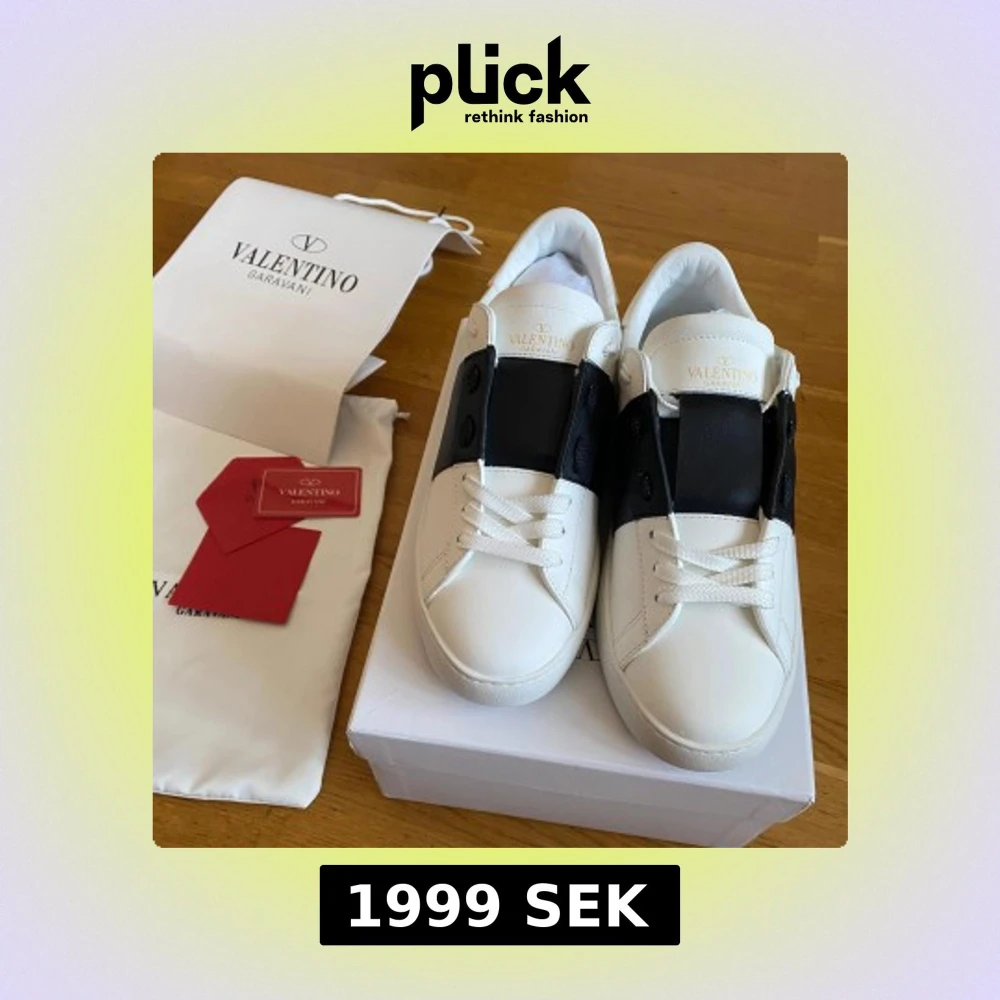 Snygga Valentino Garavani Open sneakers i vitt skinn med bred svart läderdetalj över vristen. Klassisk rund tå, vita snören och diskret logga på plösen. Sulan har coolt mönster och nitar baktill för extra edge.