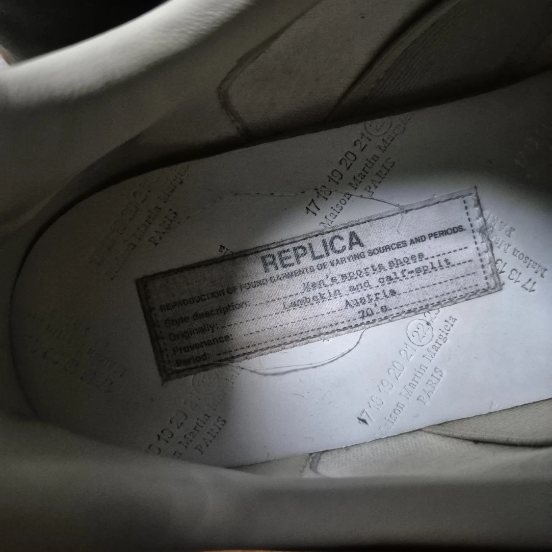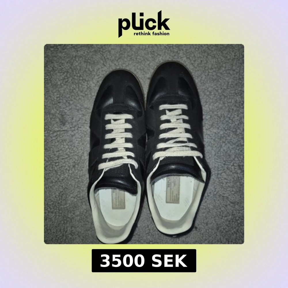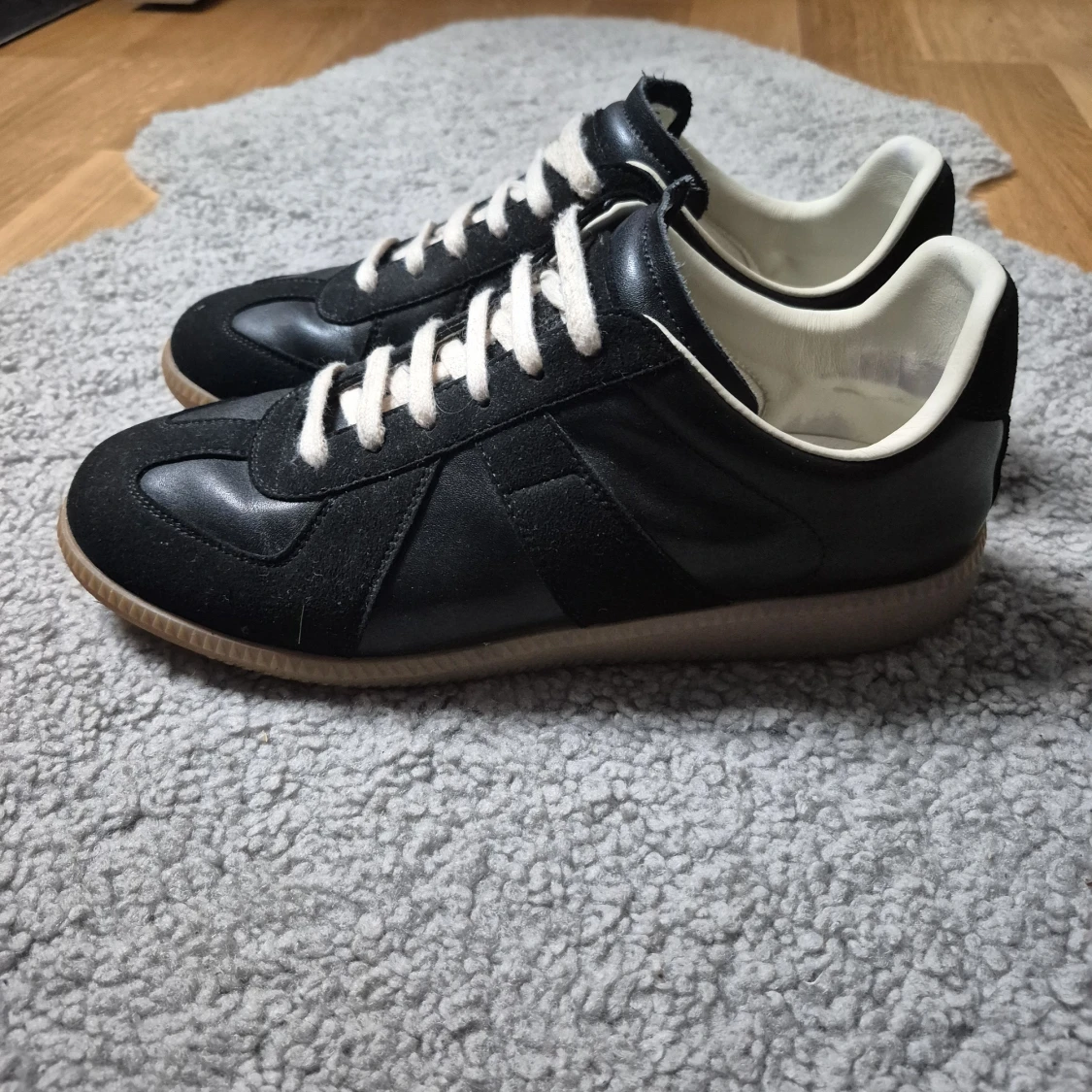 SMS FÖR AUTENTISERING. Maison Margiela GATS sneakers i svart skinn och mocka med vita snören och beige sula. Klassisk low-top siluett med rund tå och stilren design. Insidan är vit och skon har märkning på innersulan. Perfekta för dig som gillar minimalistisk och tidlös stil. Har haft dom i några månader och använt dom typ varje dag och dom har endast få tecken på slitningar.