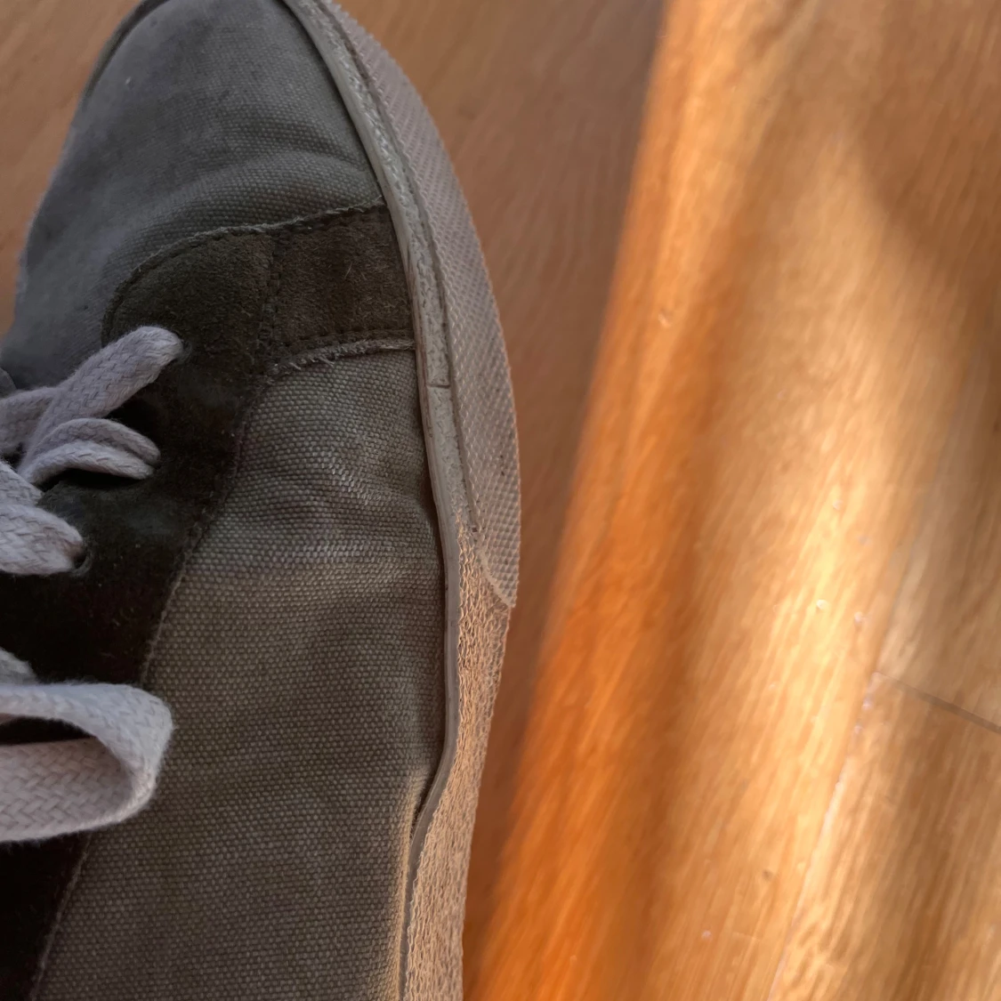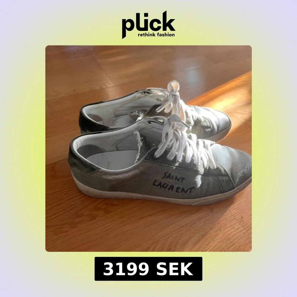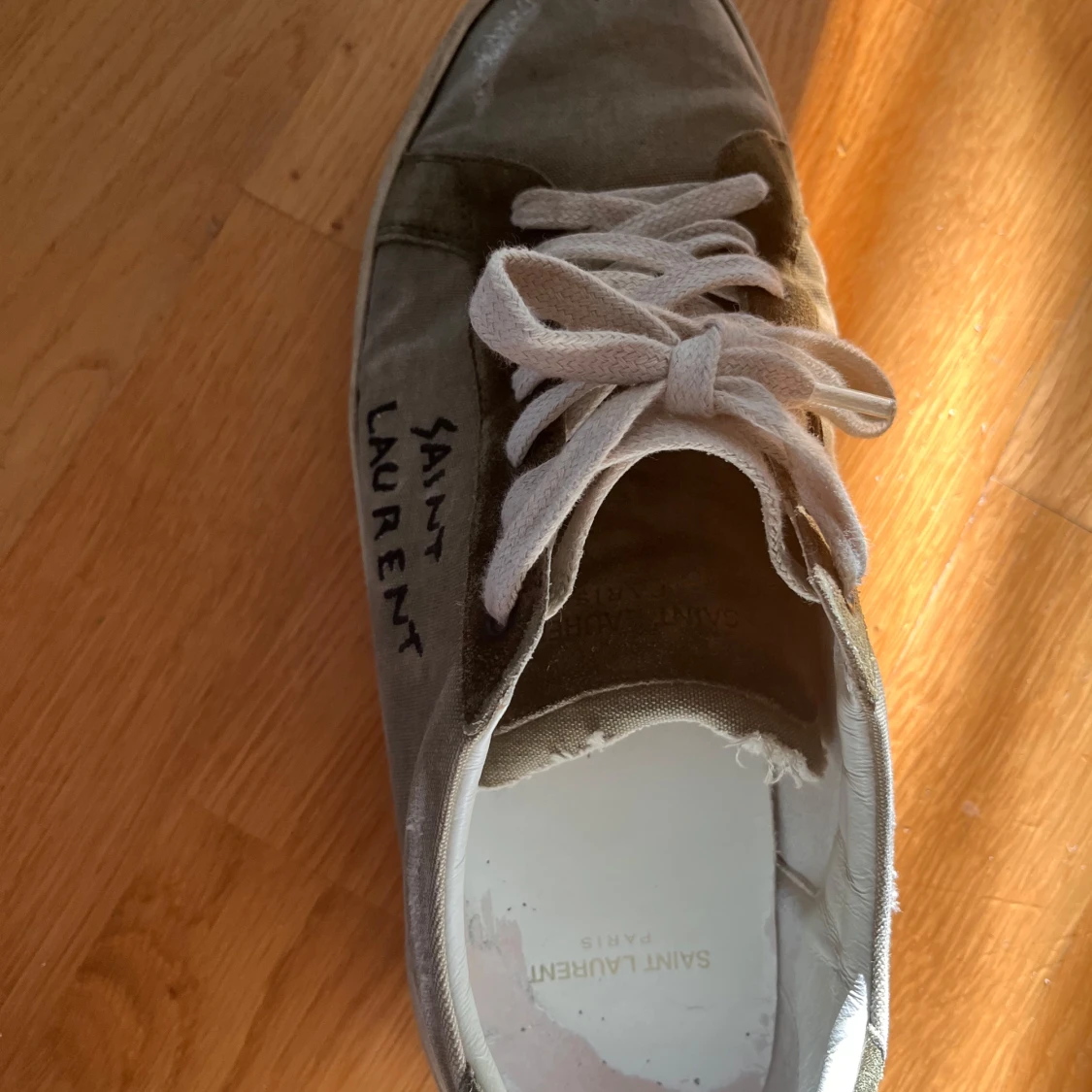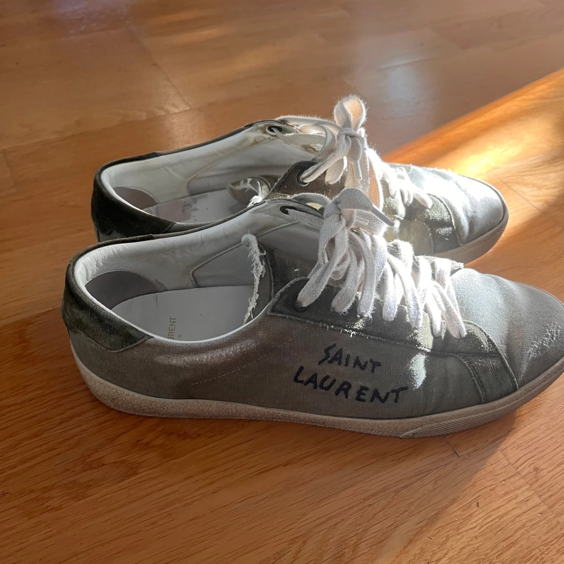 Gröna sneakers från Saint Laurent med vit sula och vita snören. Skorna har en kombination av canvas och mocka, med handskriven logga på sidan. Klassisk låg modell med rund tå och platt sula, perfekt för en avslappnad och trendig look. Sulan håller på att lossna lite men går enkelt att limma hos en skomakare om man vill.