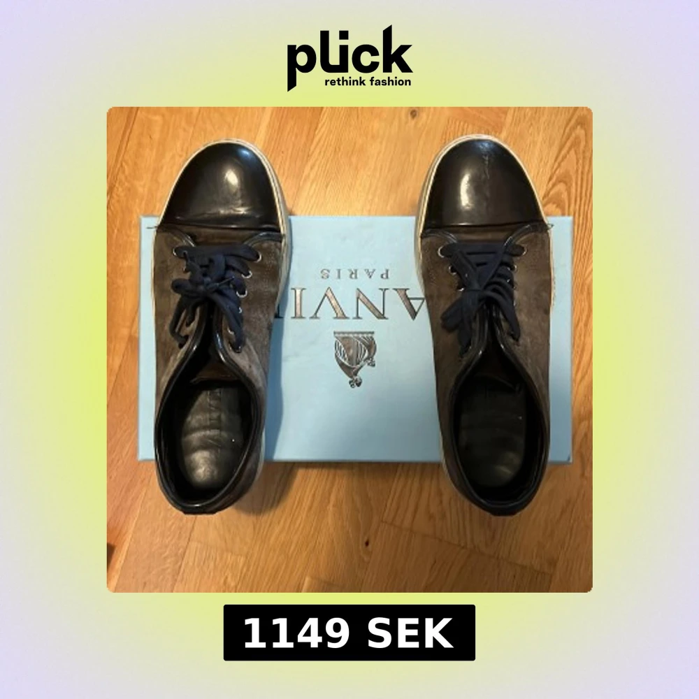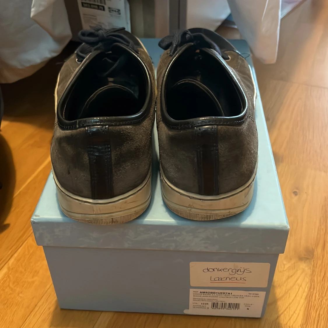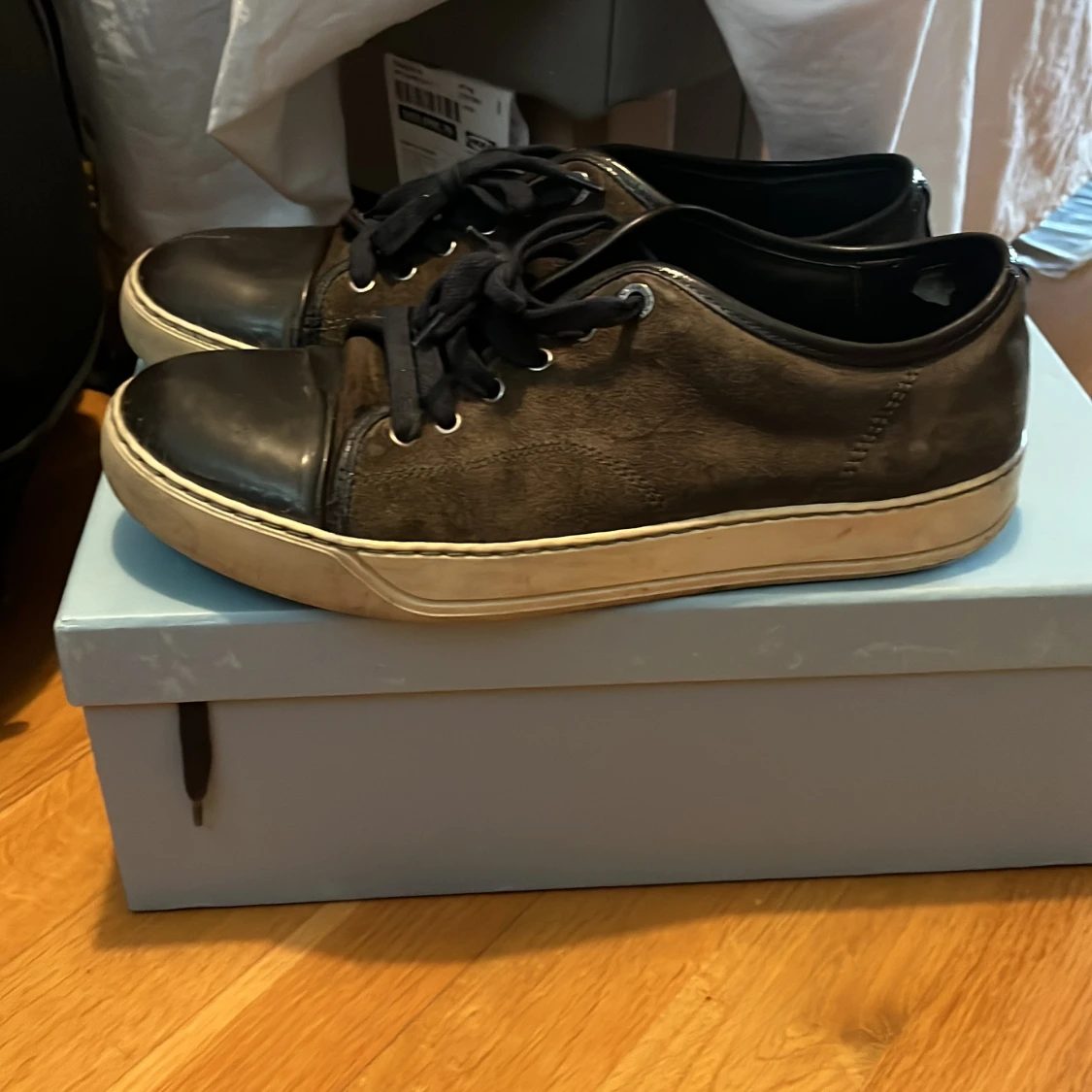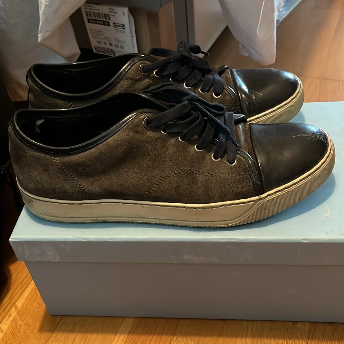 , Snygga sneakers från Lanvin i mocka med svarta skinn-detaljer på tå och häl. Skorna har mörkblåa snören, . Perfekt för dig som gillar stilrena och exklusiva sneakers med en lyxig känsla. Skriv för fler bilder eller frågor! litet skrapmärke på ena captoen.