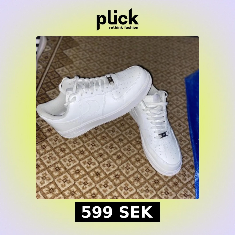 Snygga och klassiska vita Nike Air Force One. Skorna har används 2-3 gånger men är fortfarande ganska nya och i mycket bra skick.