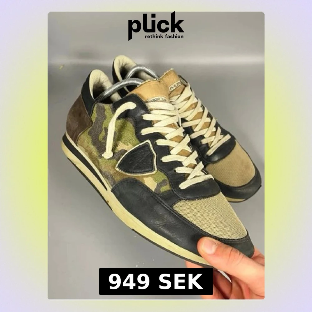 Storlek 45 men passar även 44 .Snygga sneakers från Philippe Model med coolt kamouflagemönster i grönt och brunt, svarta skinnpaneler och beige mesh. Skorna har vita snören och detaljer i mocka och läder. Perfekta för dig som vill sticka ut med en urban och sportig stil.