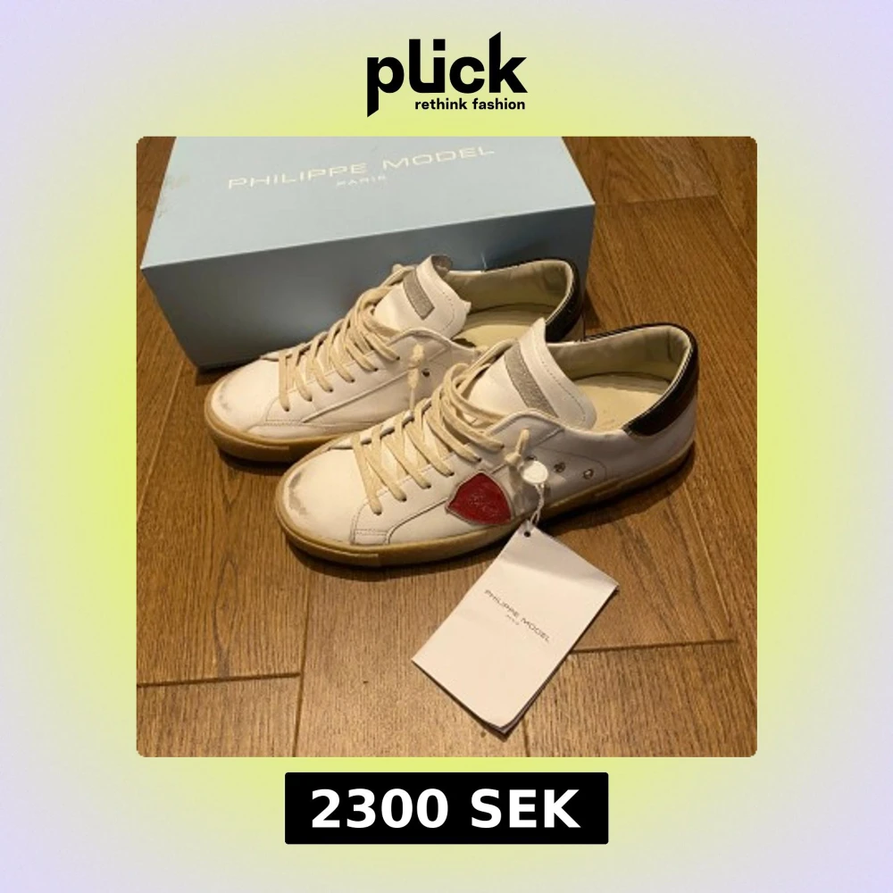 Storlek 43-44Säljer ett par vita Philippe Model sneakers med beige sula, svarta detaljer på hälen och en röd hjärtdetalj på sidan. Skorna har snörning och är tillverkade i skinn. Perfekta för dig som vill ha en unik och stilren look.