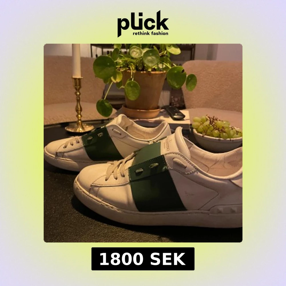 Snygga Valentino Garavani sneakers i skick 8/10, det är lite snören som sticker ut men de går bra! . Skorna har en stilren design med snörning och en bred grön rem över ovansidan. Perfekta för en trendig look. Jag e intresserad av byten också 👍🏻👍🏻✅✅, hör av er om ni har frågor eller funderingar 😃 box o kvitto ingår tyvärr inte men de är äkta!
