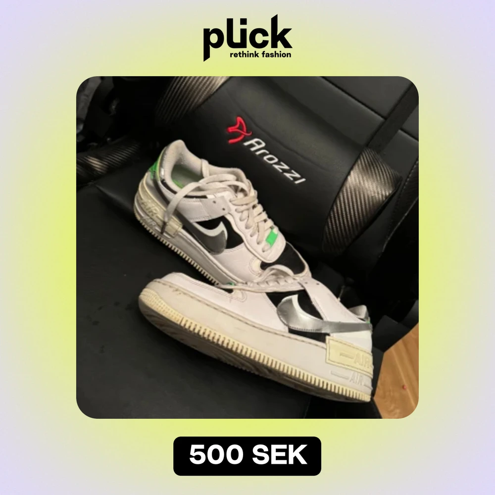 Säljer ett par Nike Air Force sneakers i vitt och svart med coola gröna detaljer. Skorna har en klassisk design med snörning och en bekväm passform. Perfekta för vardagsbruk och ger en stilren look.