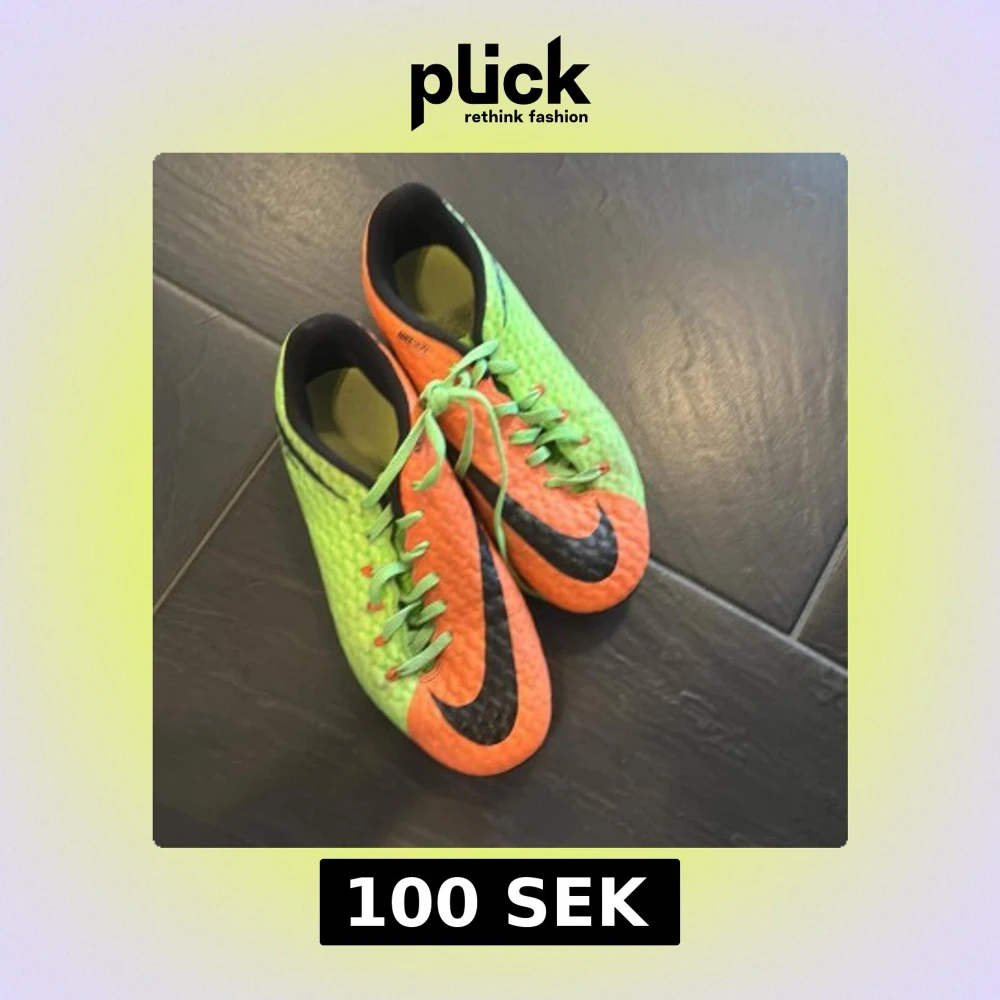 Säljer ett par iögonfallande fotbollsskor från Nike i grön och orange med svarta detaljer. Skorna har snörning och dobbar för bra grepp på planen. Perfekta för fotbollsspelare som vill sticka ut!