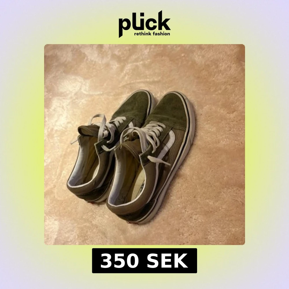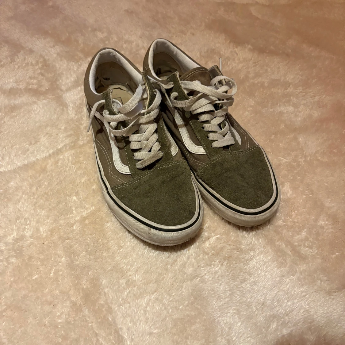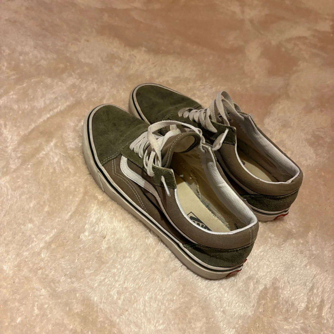 Säljer ett par klassiska Vans Old Skool sneakers i olivgrönt med vit sula och vit sidostrip. Stolrke 42,5, erbjudandet går ut 5e september