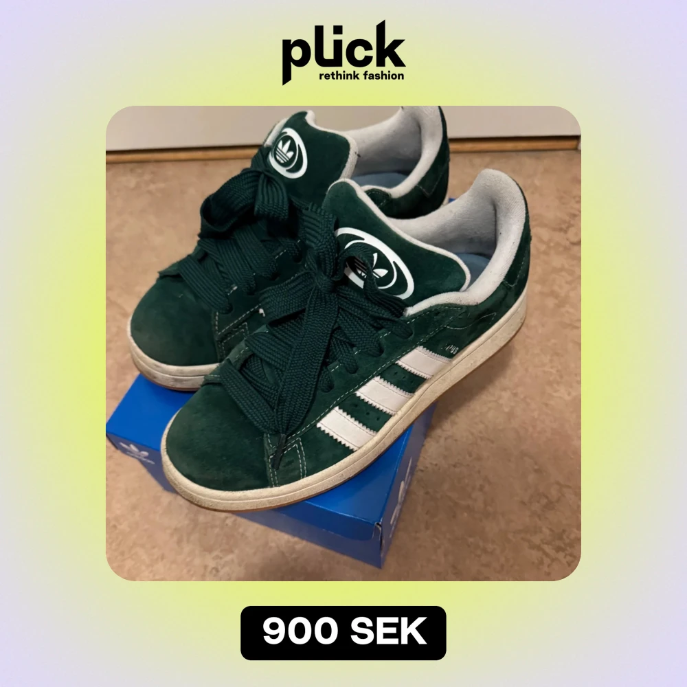 Säljer ett par snygga gröna Adidas Campus sneakers i mocka. De har de klassiska vita ränderna på sidan och en bekväm passform. Perfekta för vardagsbruk och ger en stilren look. Skorna är i bra skick med lite slitage på sulan. Kommer i originalkartong.