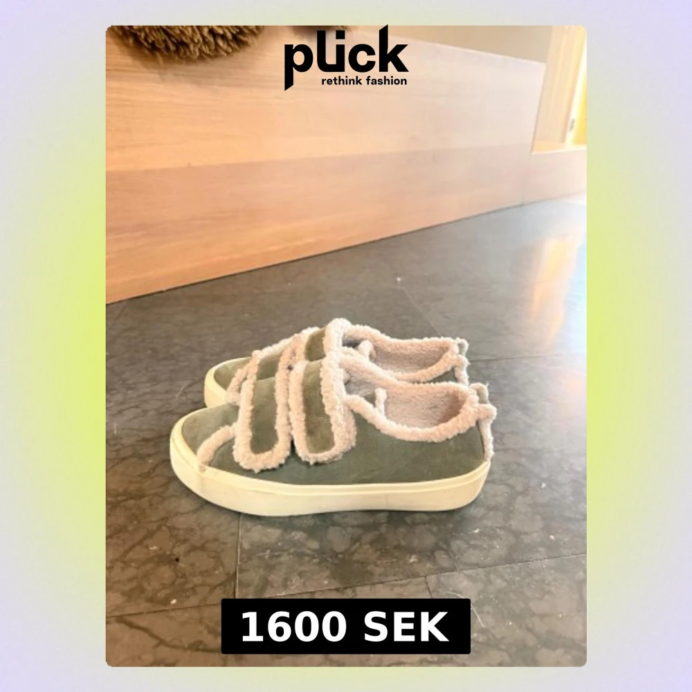 Unika sneakers från Inuikii i grön mocka med fluffiga beige detaljer och kardborreband. Skorna har en platt vit sula och är fodrade med mjuk fuskpäls för extra komfort. Ny pris 2600kr