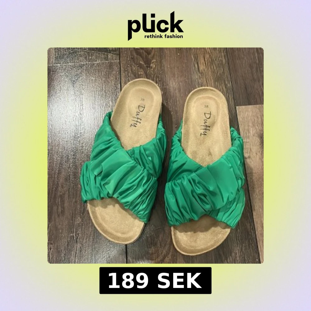 Säljer ett par gröna sandaler från Duffy med breda, draperade band i syntetmaterial. Skorna har en bekväm, platt sula i vitt och korkdetaljer på sidorna. Perfekta för varma dagar och enkel att matcha med sommarens outfits.