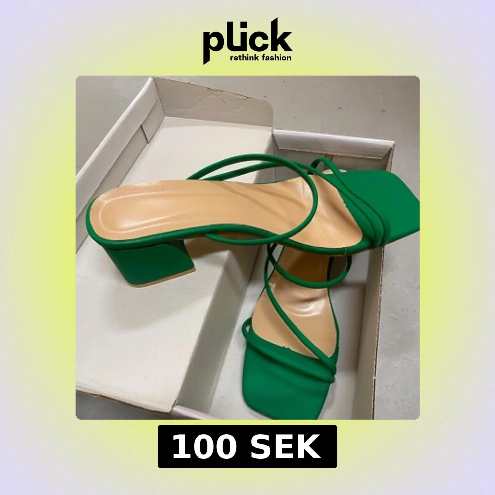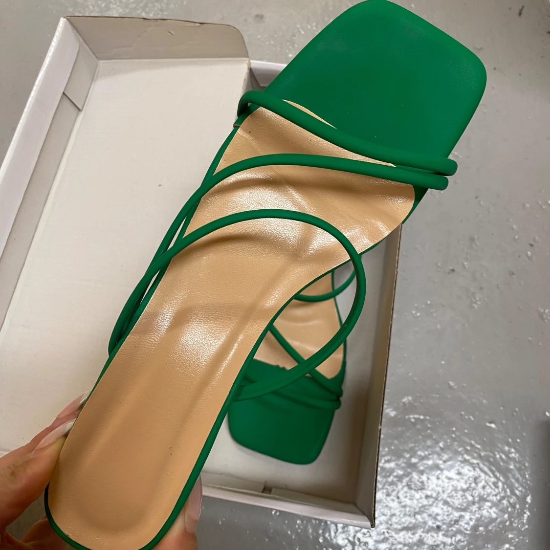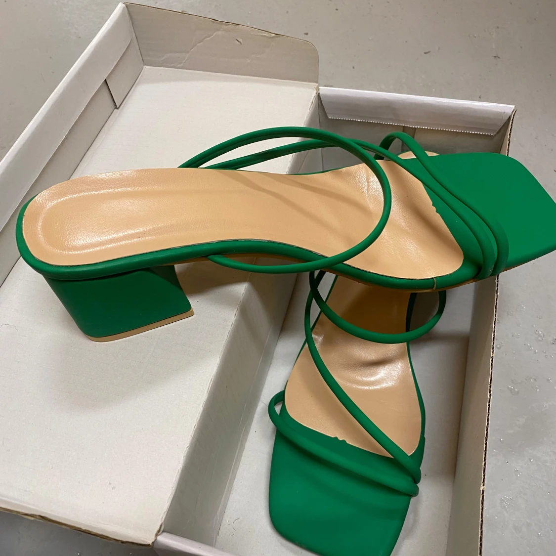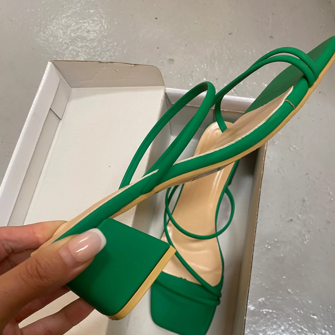 Snygga gröna sandaler med klack och smala remmar. Perfekta för en stilren look med öppen tå och fyrkantig form. Använda en gång