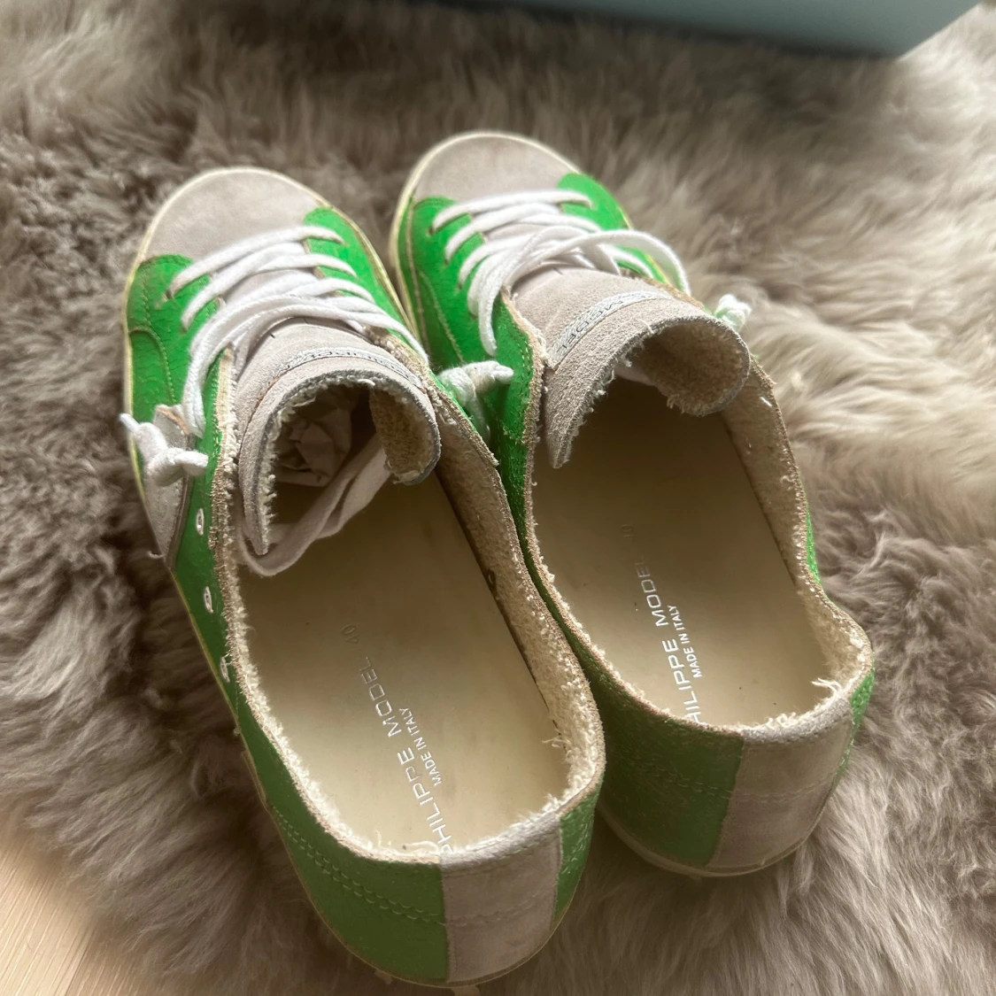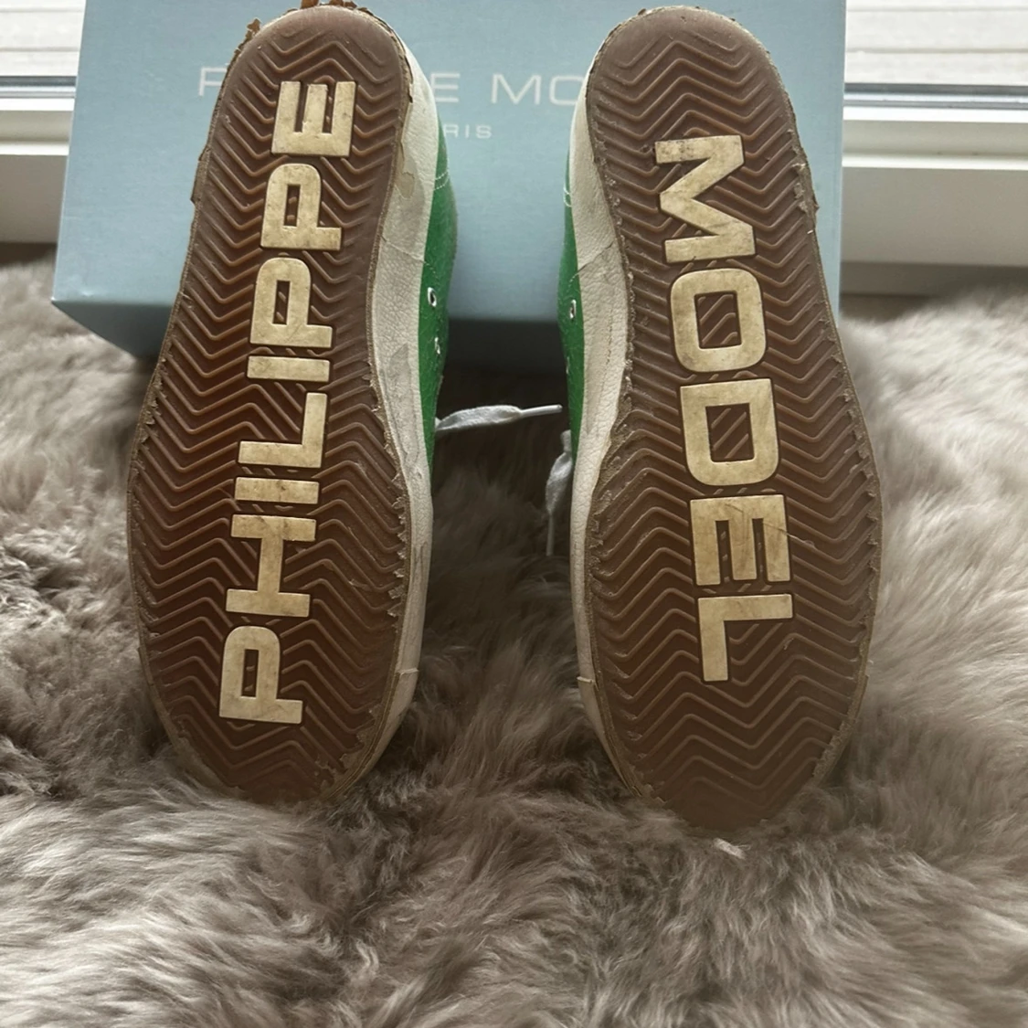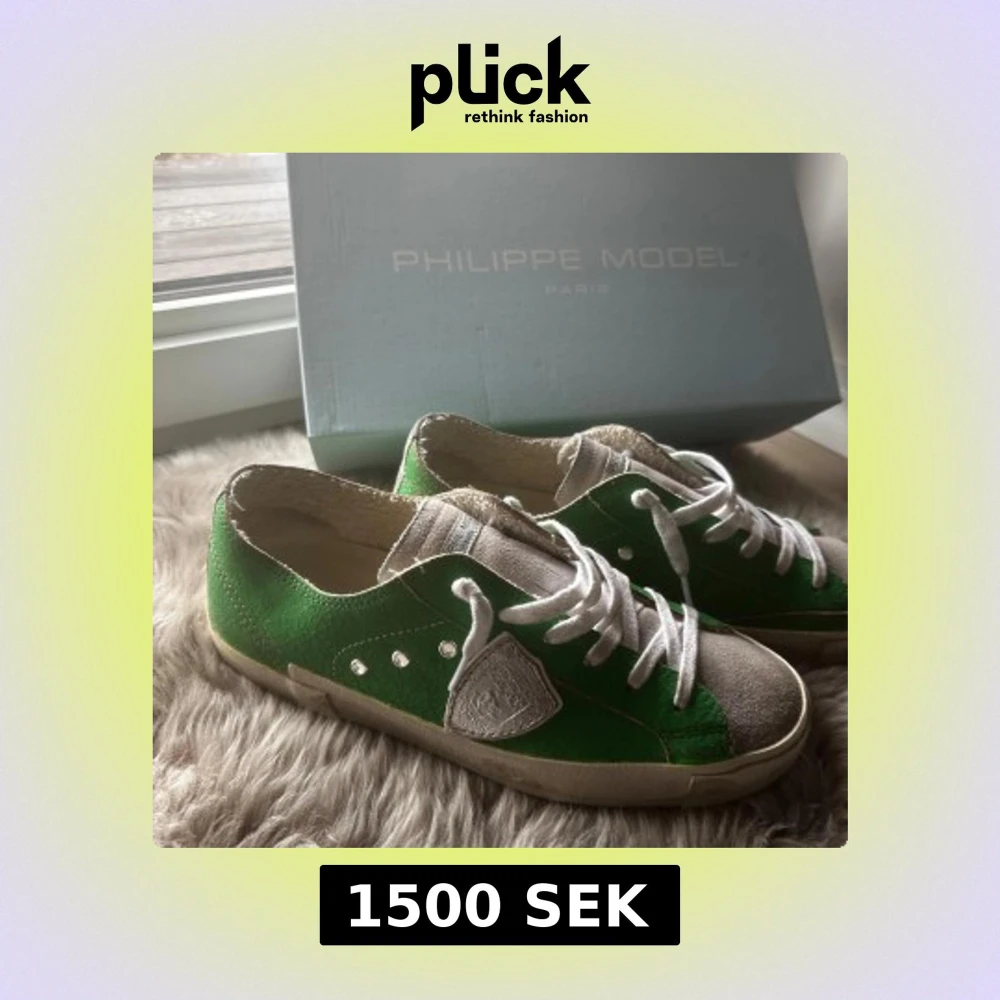 Snygga gröna sneakers från Philippe Model med vita detaljer och snörning. Skorna har en unik design med märkets logga på sidan och text på sulan. Perfekta för en stilren look. Kostar 3727kr ny pris. Har kvitto och box.