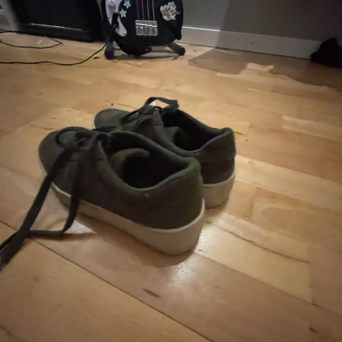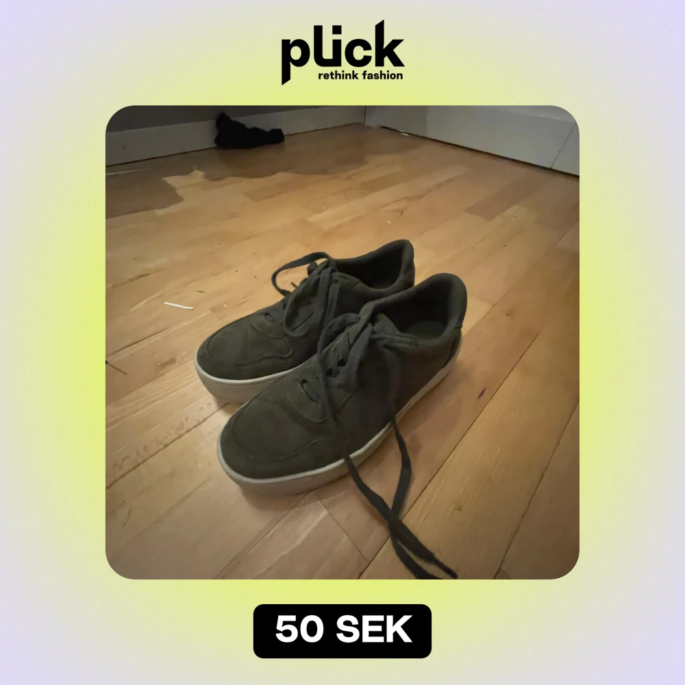 Säljer ett par gröna sneakers i mocka med snörning och vit sula. De är i storlek dam 38 och i bra skick. Perfekta för vardagsbruk och ger en stilren look.