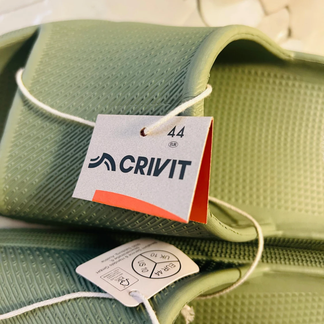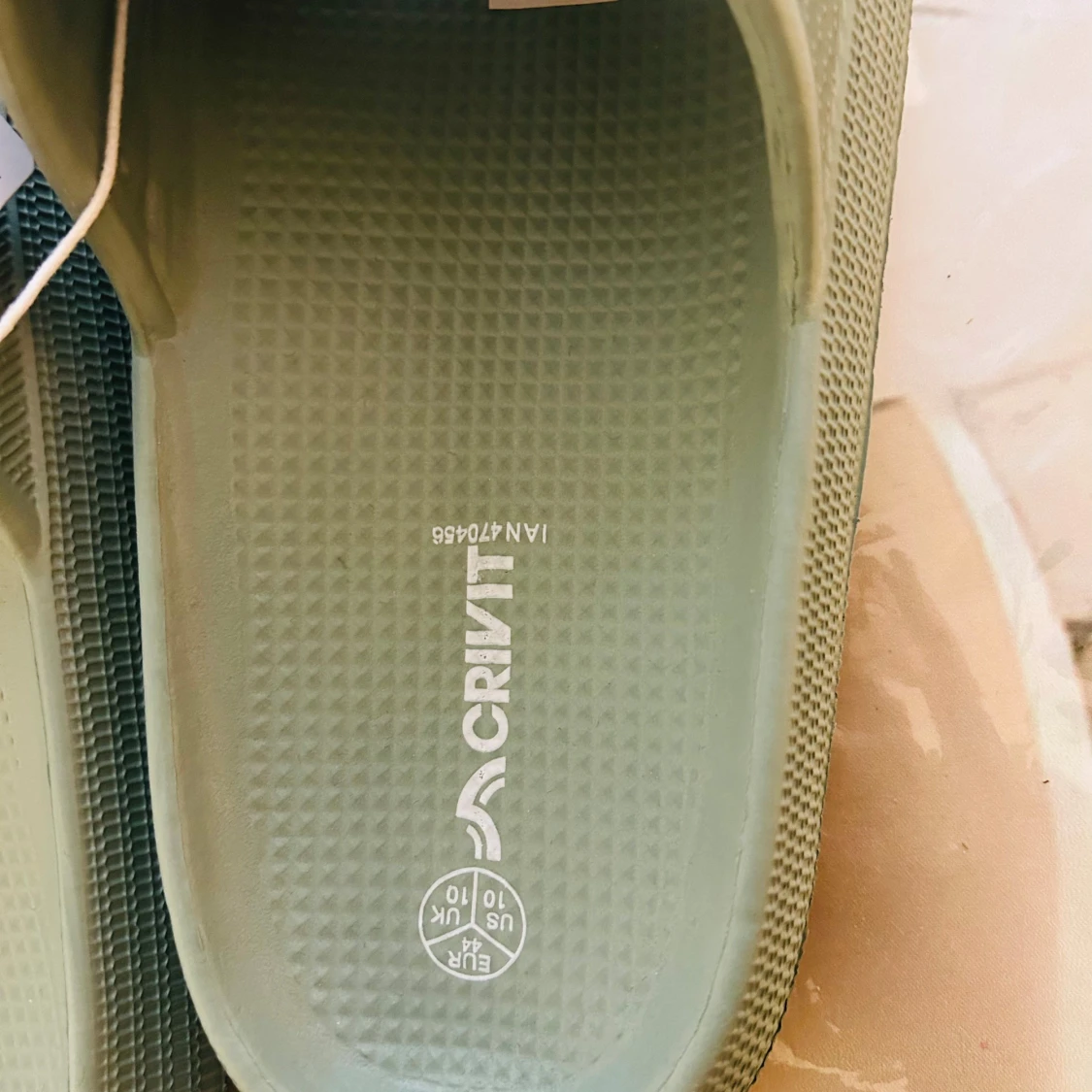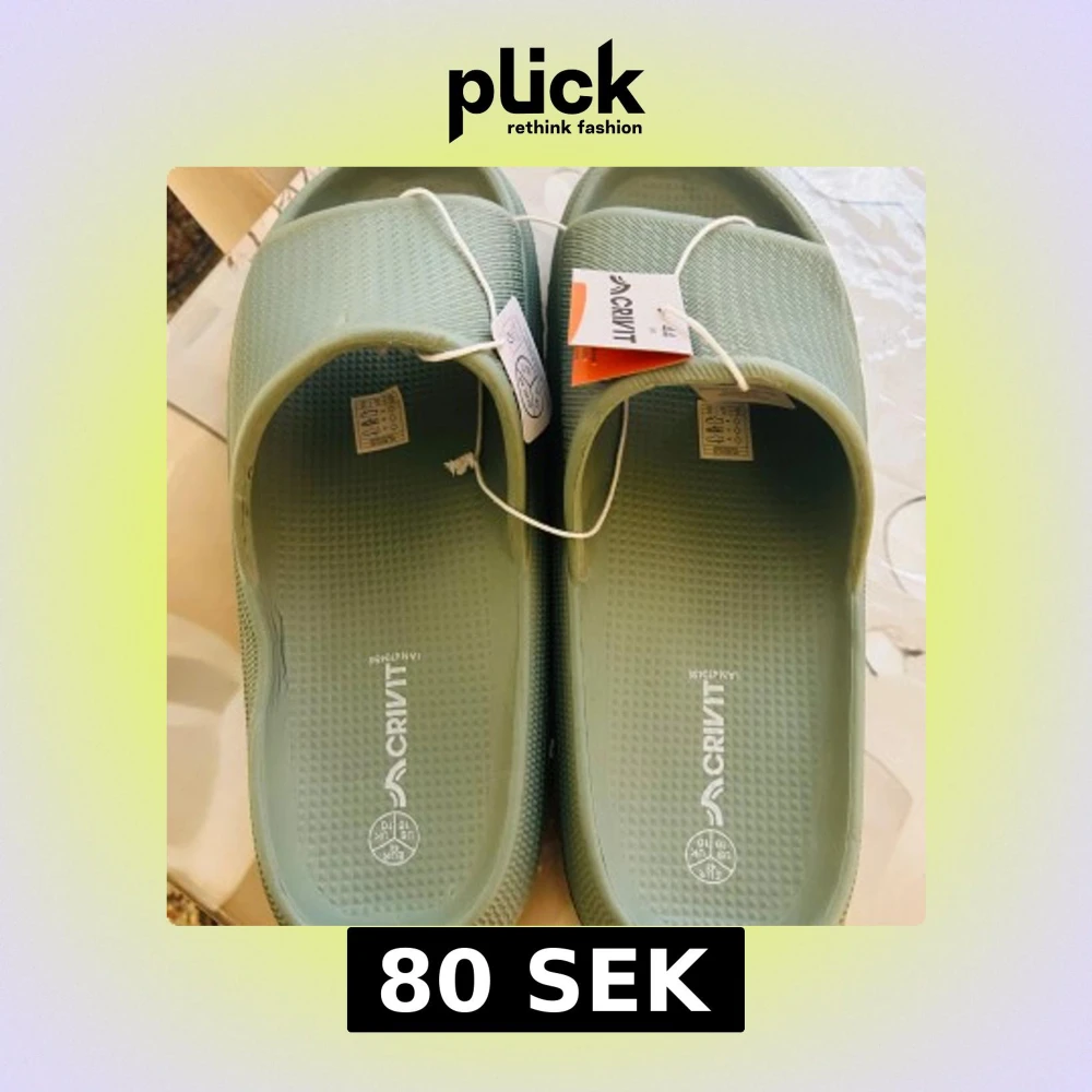 Snygga ljusgröna sandaler/ tofflor från Crivit i storlek 44. Tillverkade i syntetmaterial med räfflad sula och öppen tå. Perfekta att ha ute eller i stranden, med enkel slip-on design och bekväm passform.