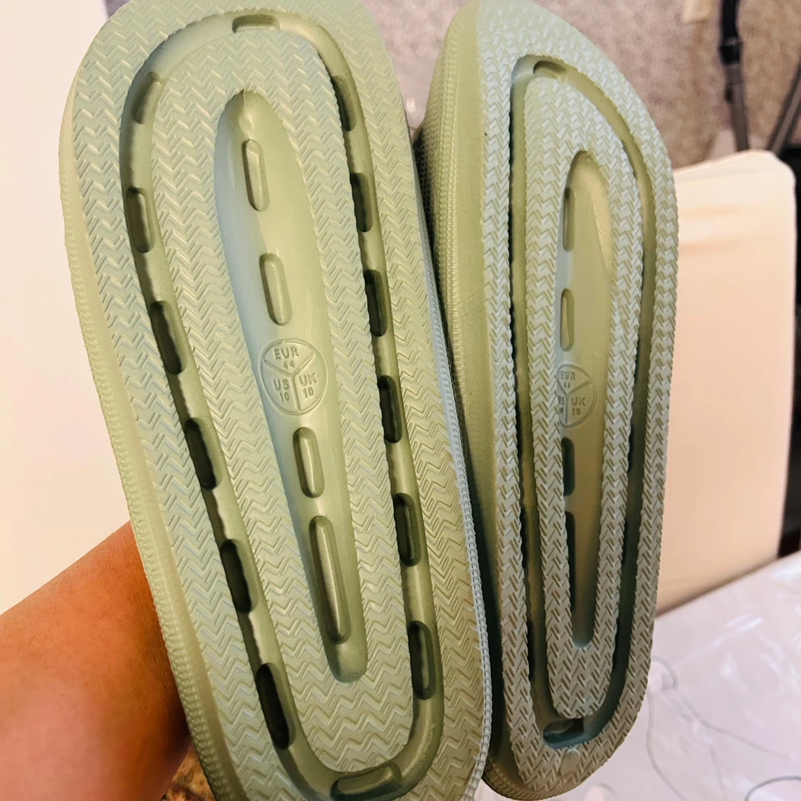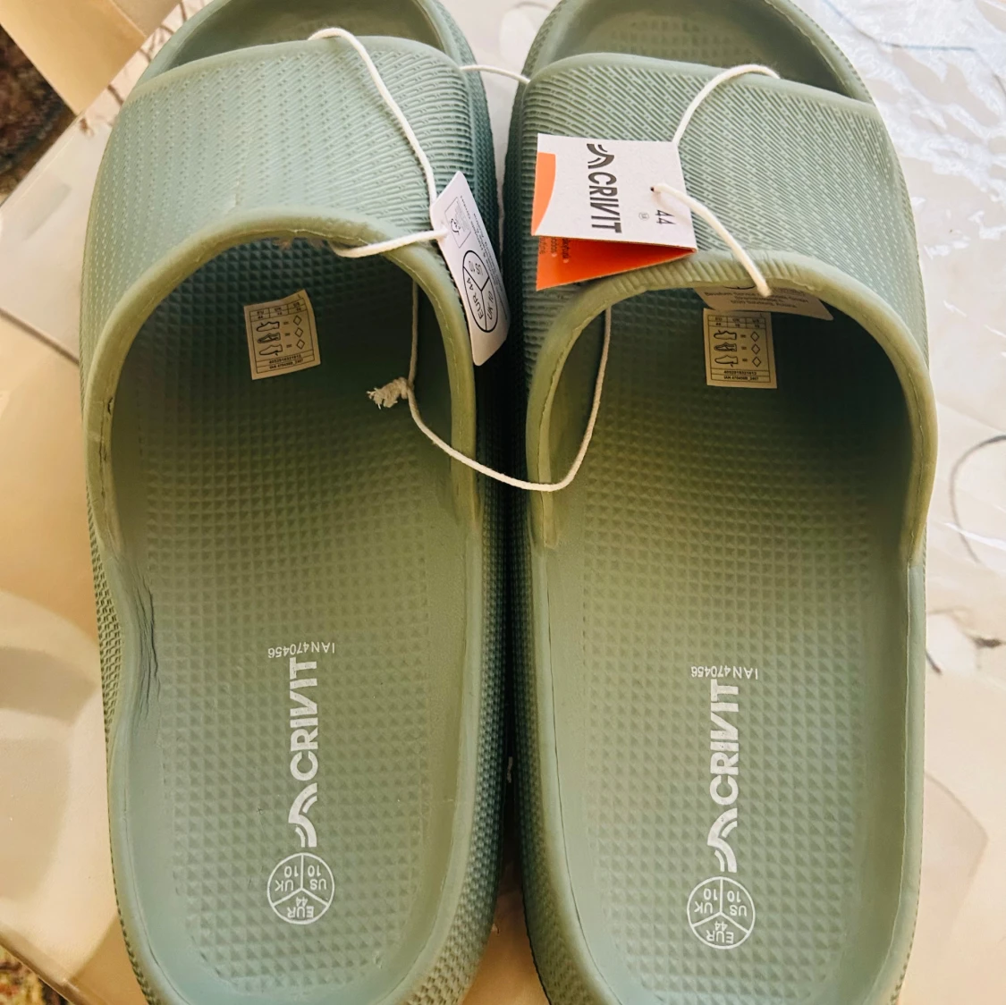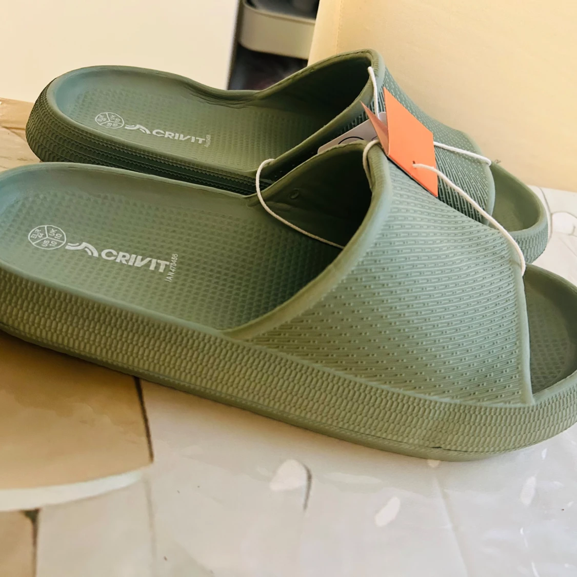 Snygga ljusgröna sandaler/ tofflor från Crivit i storlek 44. Tillverkade i syntetmaterial med räfflad sula och öppen tå. Perfekta att ha ute eller i stranden, med enkel slip-on design och bekväm passform.