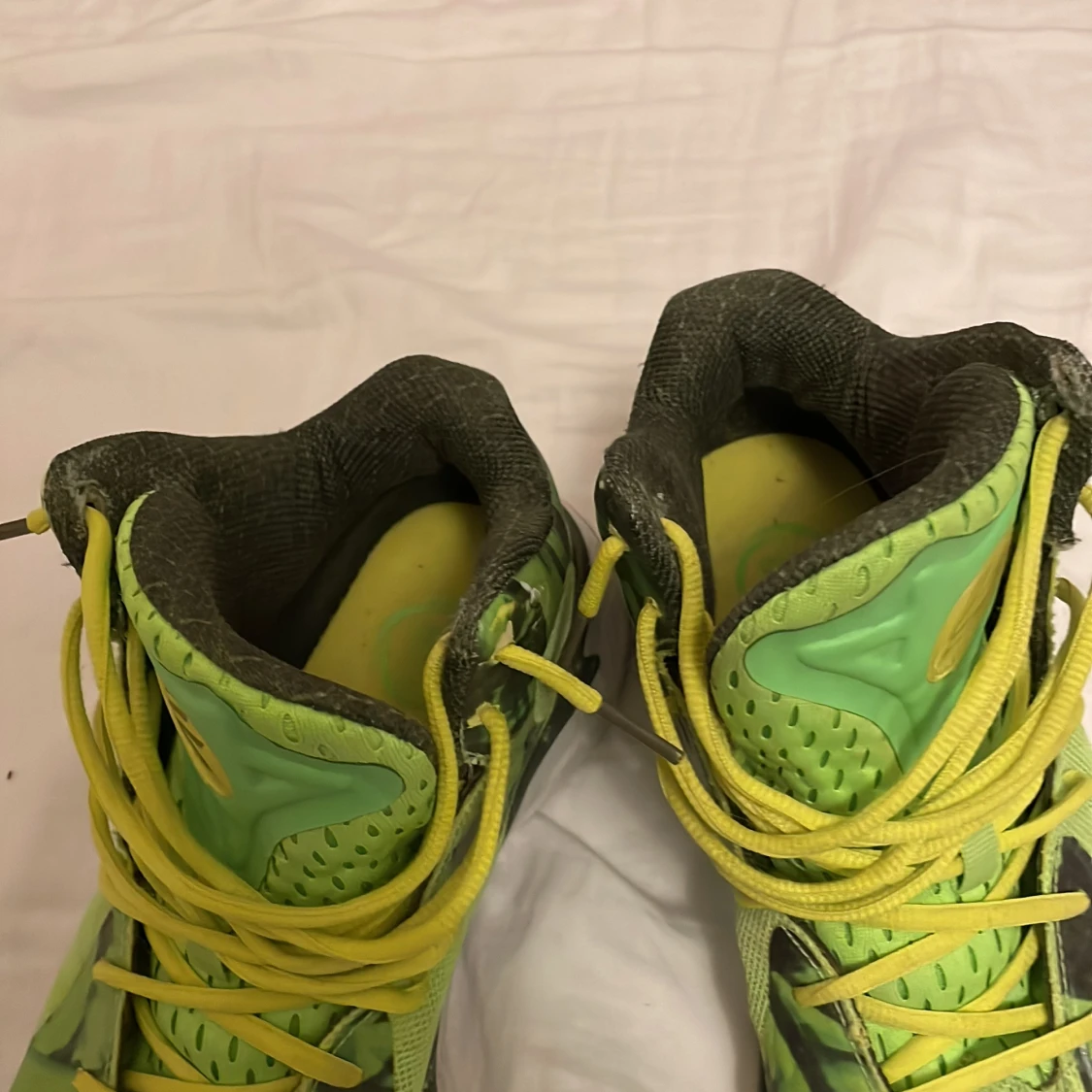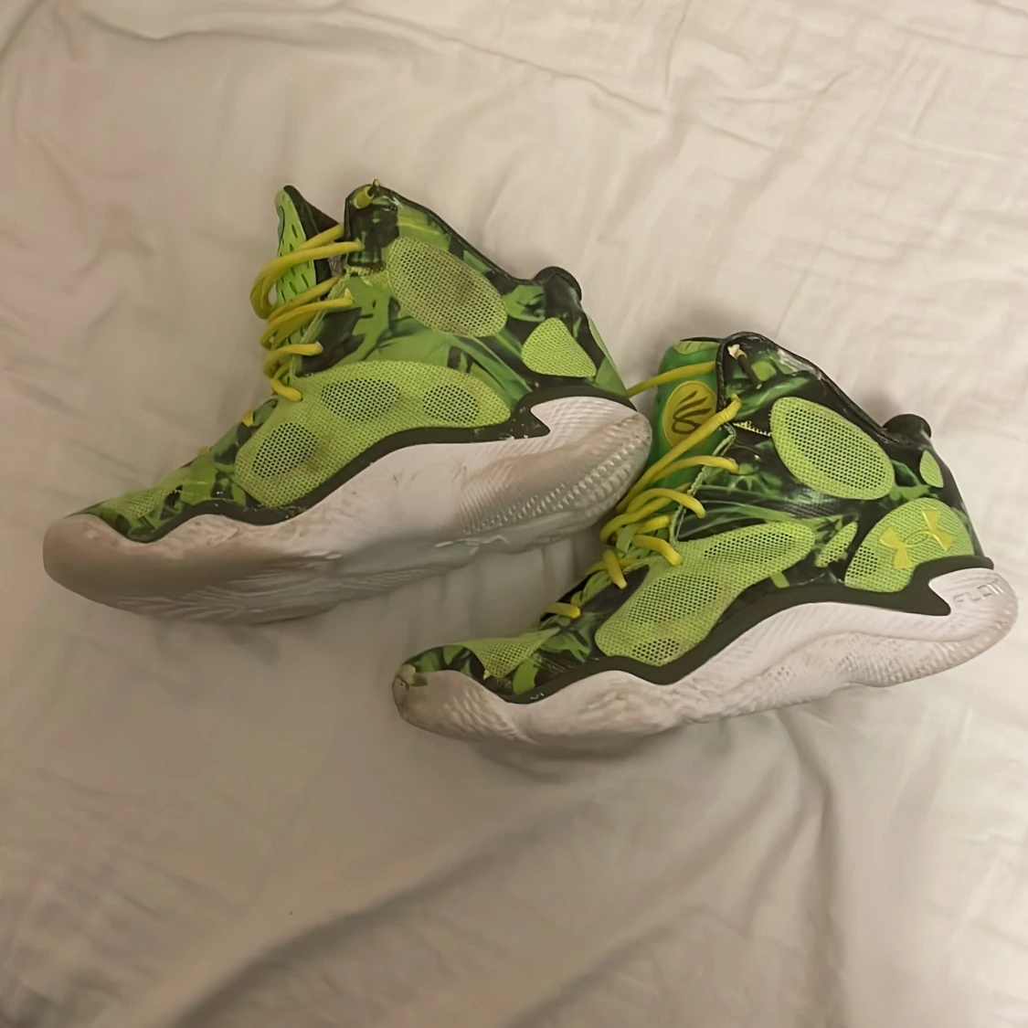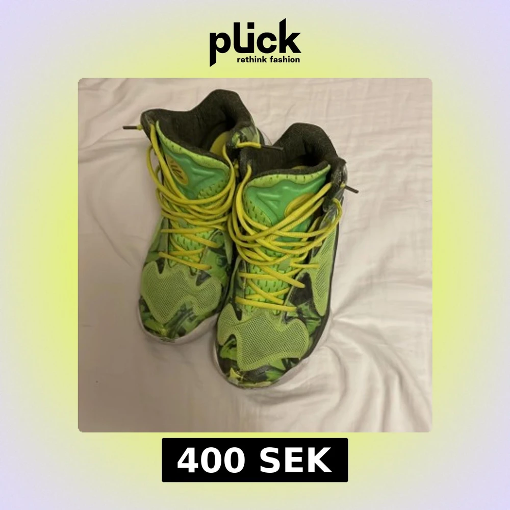 Säljer ett par riktigt coola Under Armour basketskor i grönt och gult med camomönster. Skorna har högt skaft, gula snören och vit sula. Perfekta för dig som vill sticka ut med sportig stil. Materialet är syntet och mesh för bra andningsförmåga.