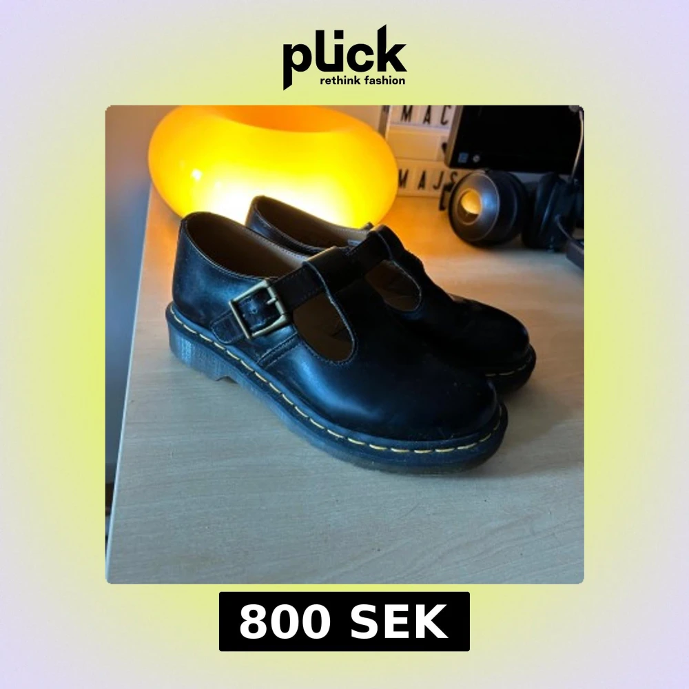 Klassiska svarta Mary Jane-skor från Dr. Martens i skinn med grov platt sula, ikoniska gula sömmar och rejäl spänndetalj i metall. Mina absolut DRÖMSKOR men de är tyvärr en storlek för små och kan tyvärr inte klämma i mig dem. Använda (eller försökt iallafall) ca 2 gånger så de är i väldigt fint skick!