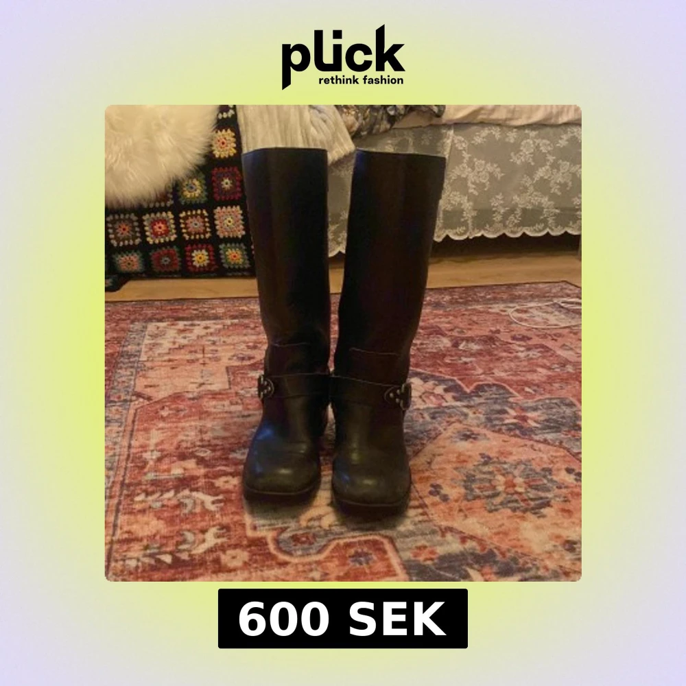 Säljer ett par svarta höga boots i skinn med coola metallspännen och nitar runt vristen och upptill. De har rund tå, platt sula och robust känsla. Perfekta för dig som gillar en edgy stil och vill sticka ut lite extra.