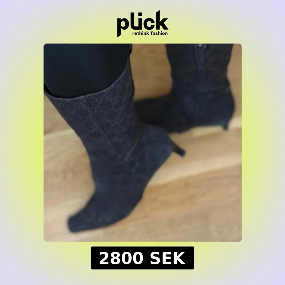 Snygga svarta stövletter med spetsig tå och dragkedja. De har en diskret mönstring av Gucci och en elegant klack som ger en stilren look. Perfekta för att lyfta vilken outfit som helst. Ord 12.000
