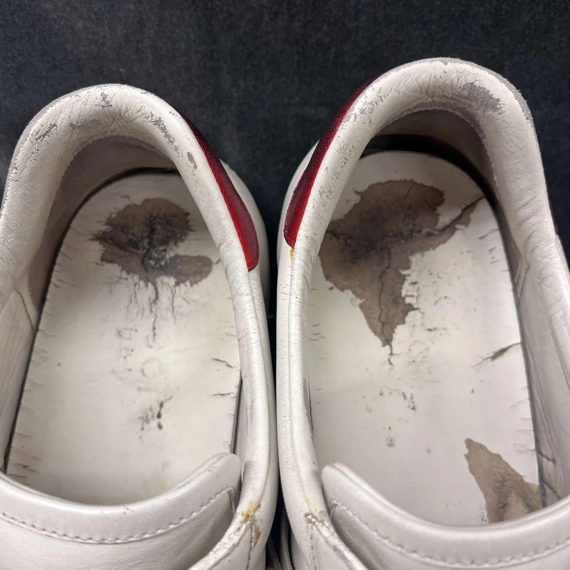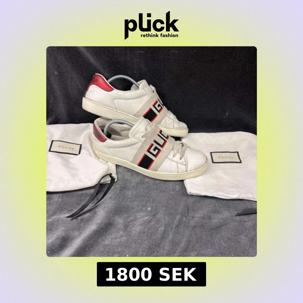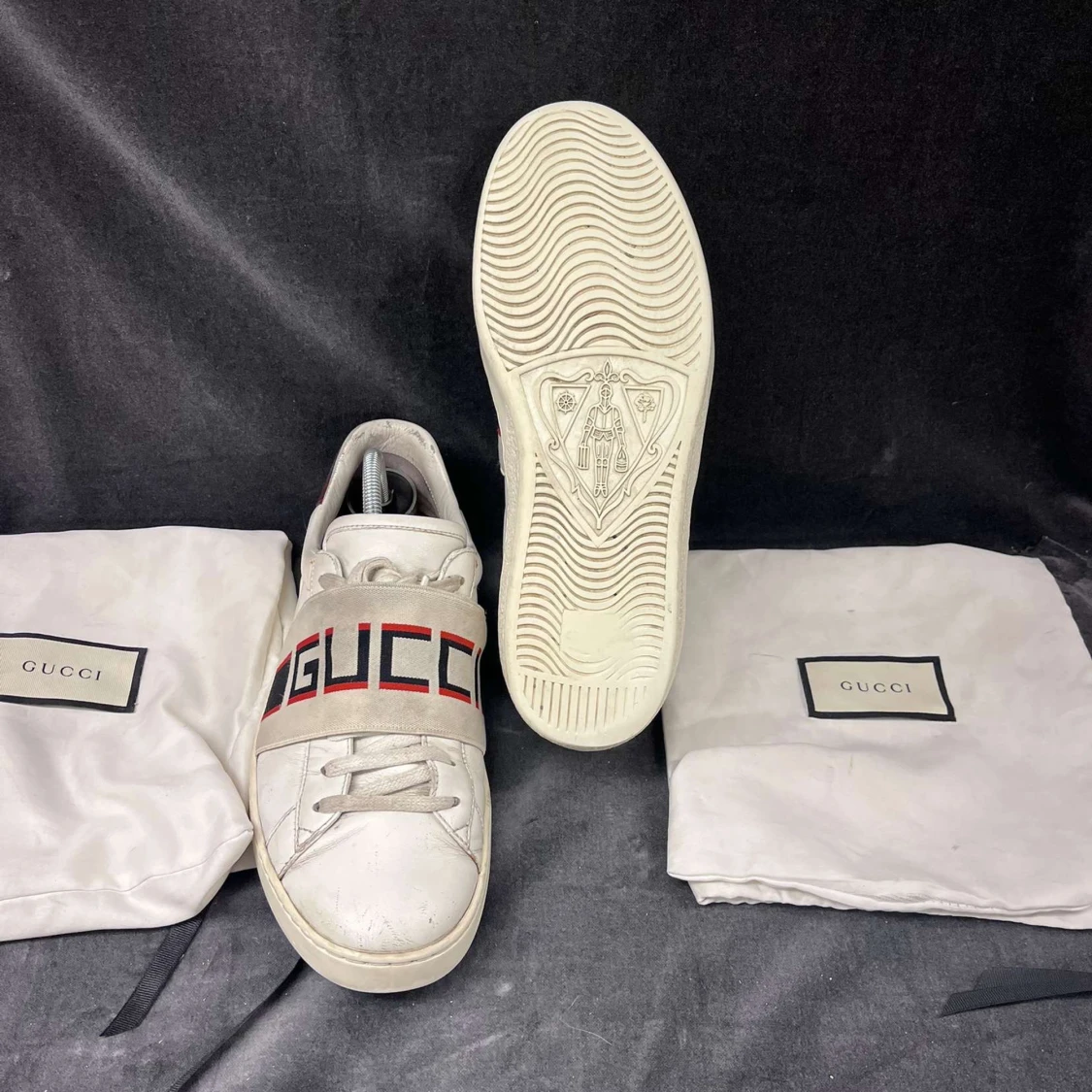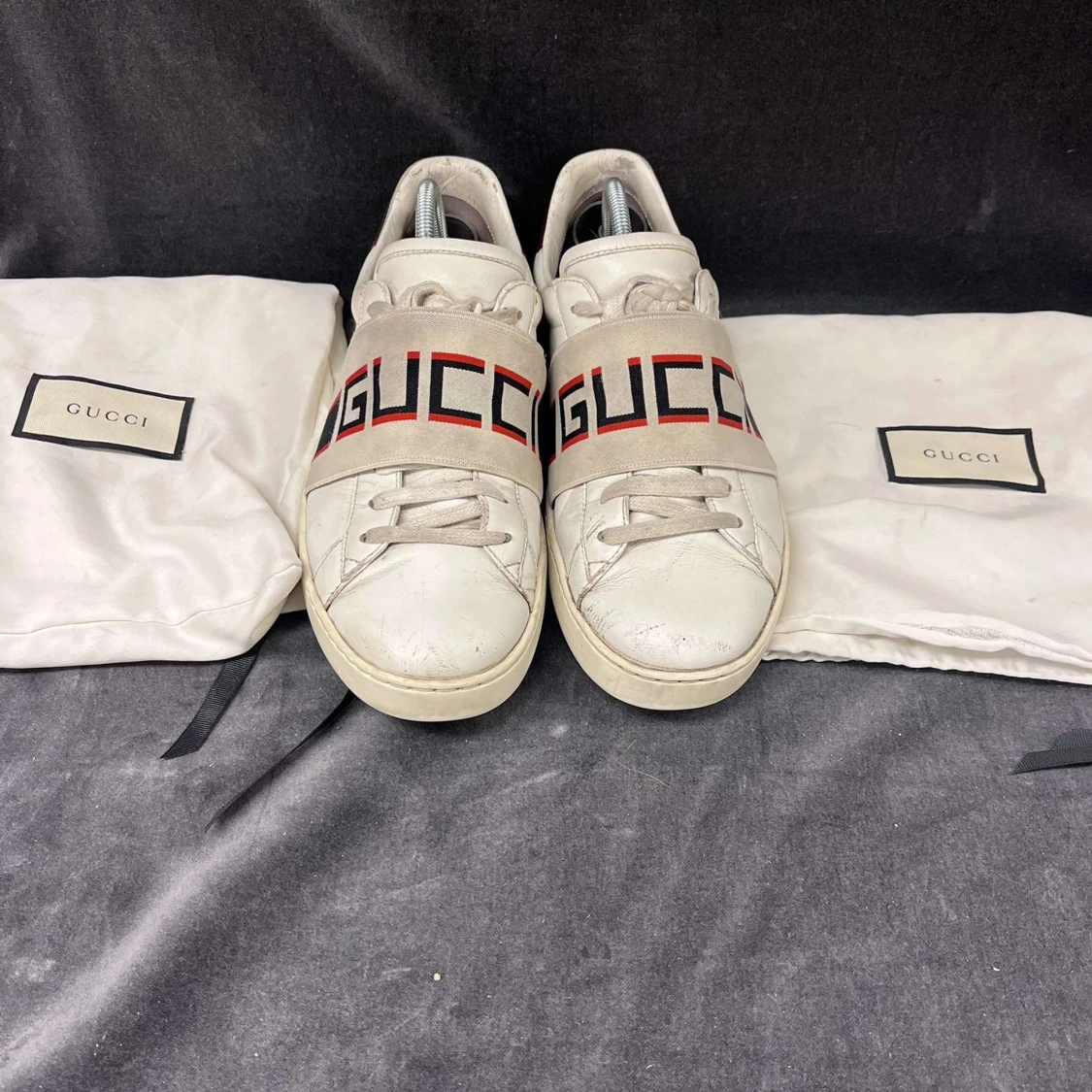 Säljer ett par vita sneakers från Gucci med breda elastiska band över foten där det står 'GUCCI' i svart och rött. Skorna har röda detaljer på hälen och klassisk rund tå. Snygg och sportig design med tydlig logga.