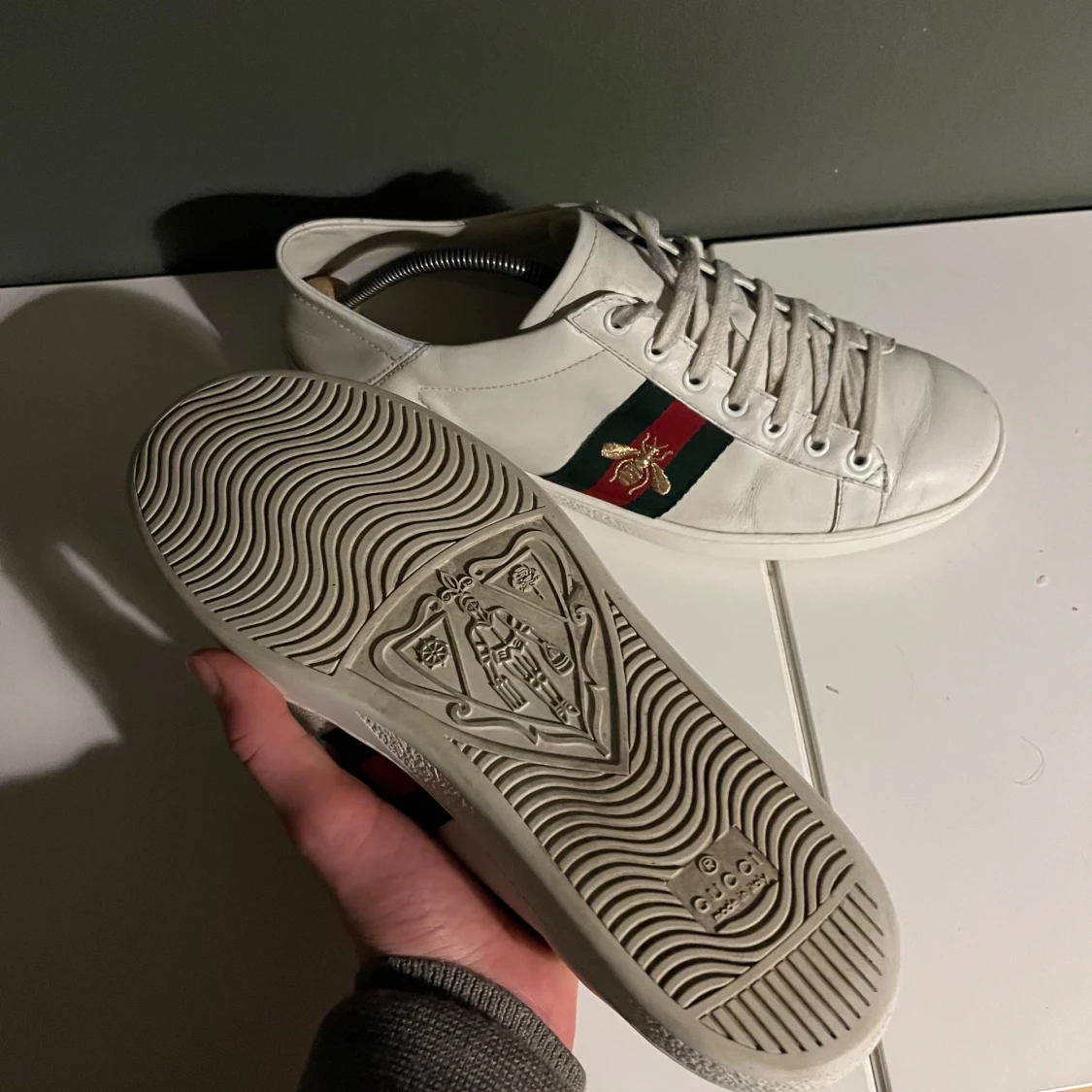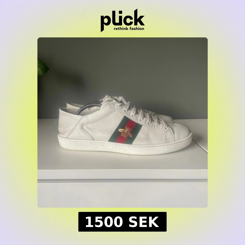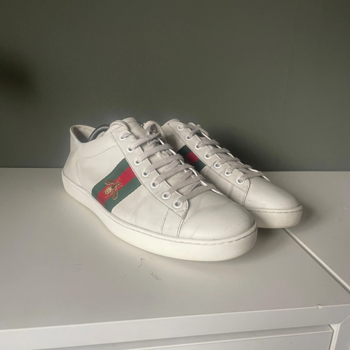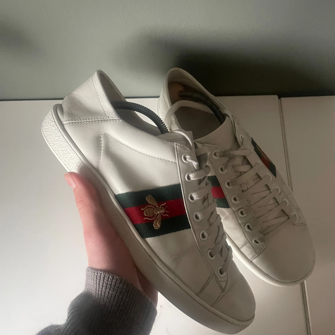 Snygga vita sneakers med gröna och röda ränder samt en guldfärgad bi-detalj på sidan. Skorna har snörning och en klassisk design som passar perfekt för en stilren look. Går runt 3999kr men säljer de för 1500kr. Perfekta till sommarn.