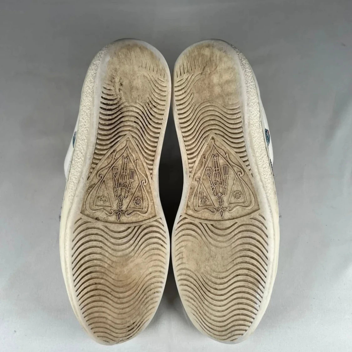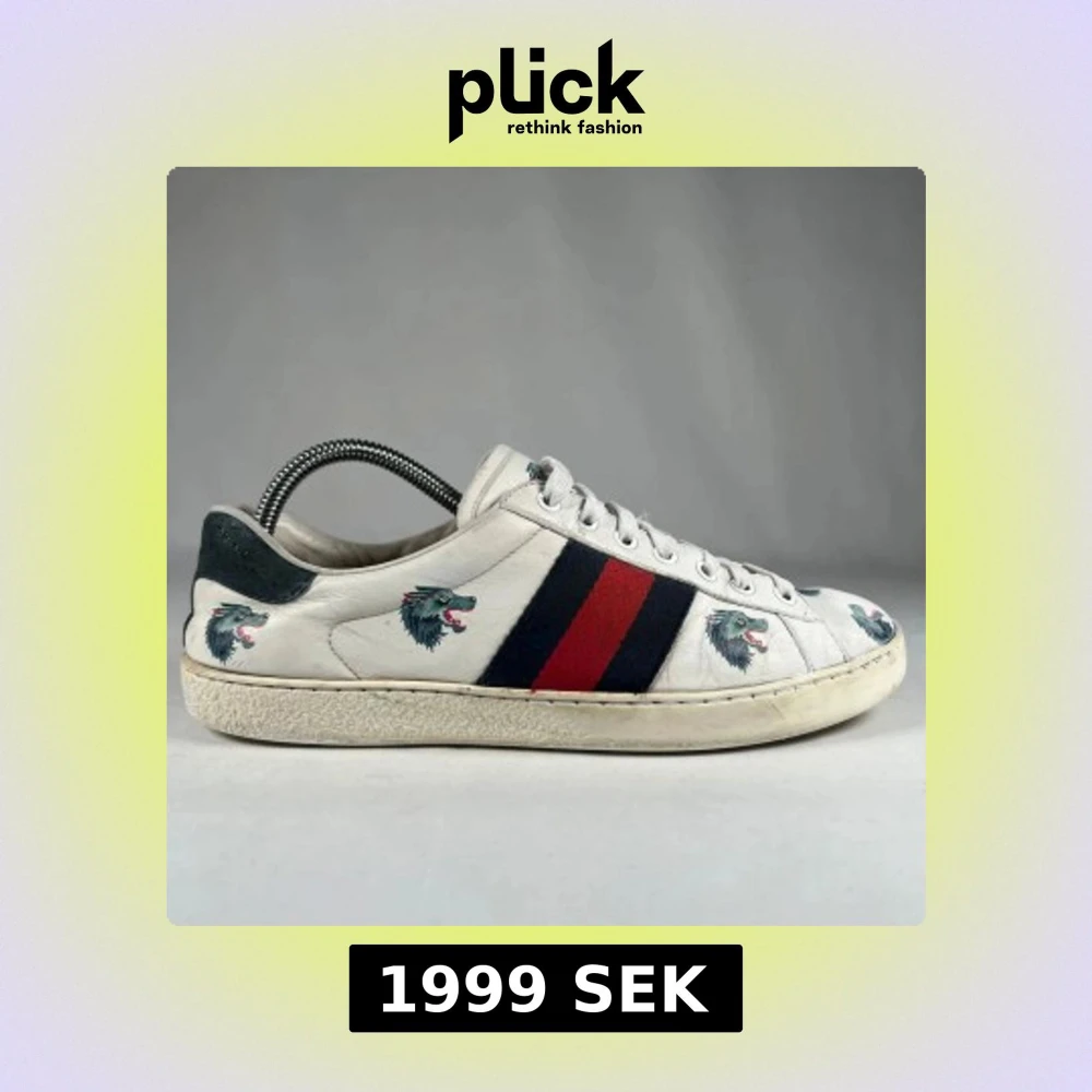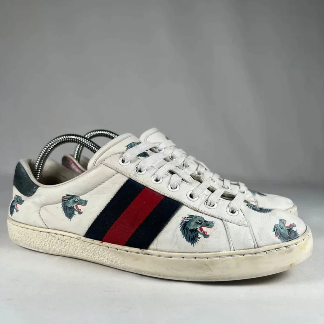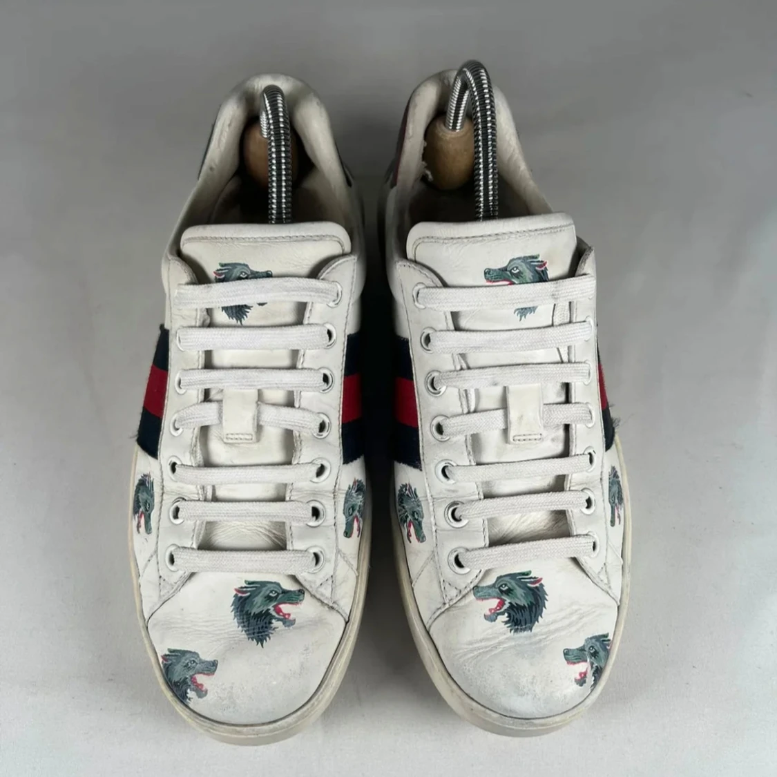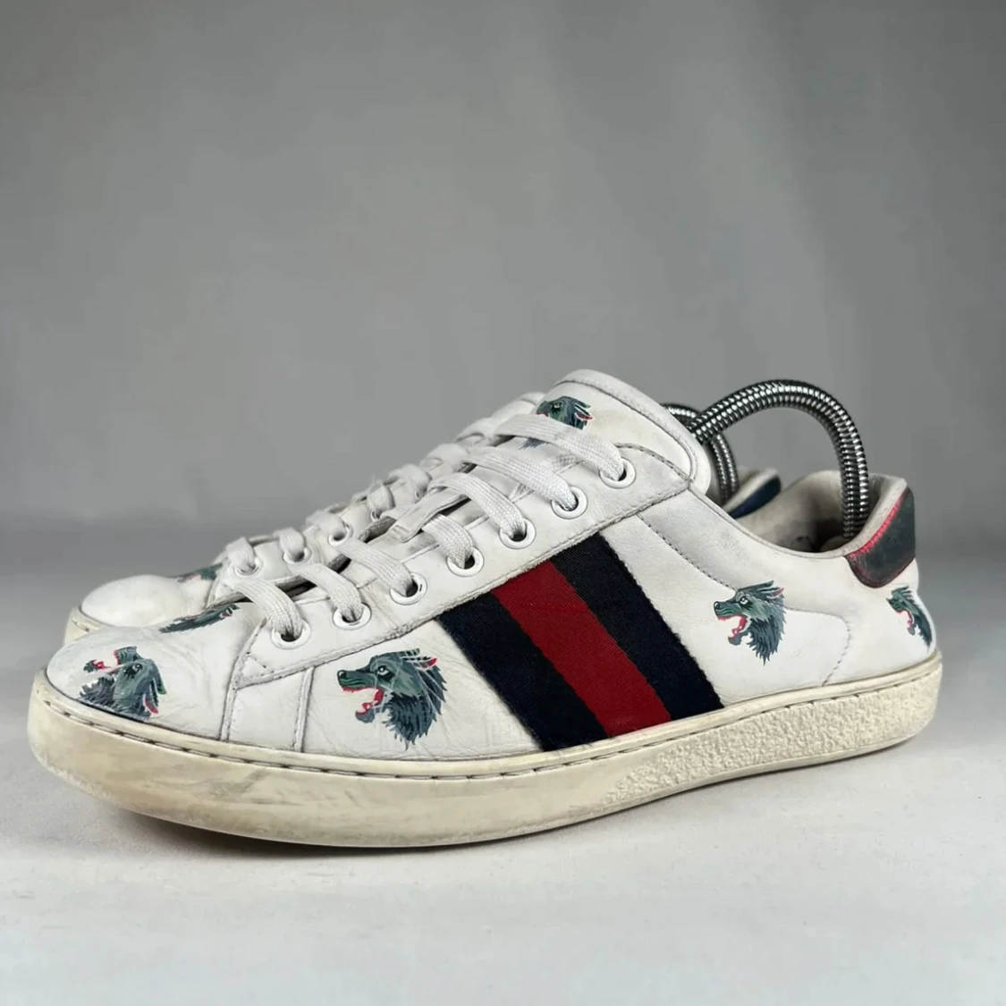 Gucci sneakers i vitt med ikoniska blå och röda ränder på sidorna. Skorna har tryckta varghuvuden över hela ovandelen och klassisk snörning. Snygg och unik design som sticker ut, perfekt för dig som vill ha något extra. Ingen box eller kvitto