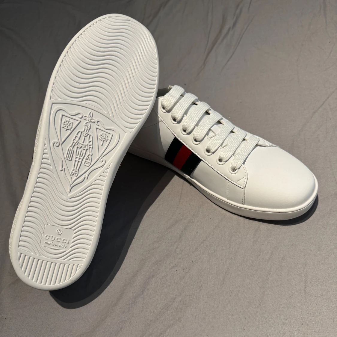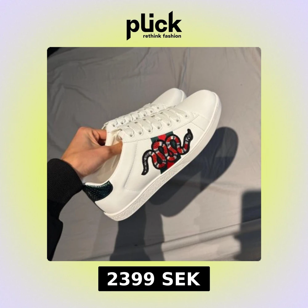 Säljer ett par vita sneakers från Gucci i skinn med klassiska gröna och röda ränder på sidan och en broderad röd-svart orm. Skorna har snörning, rund tå och platt sula. Perfekta för dig som vill sticka ut med en lyxig och trendig look.