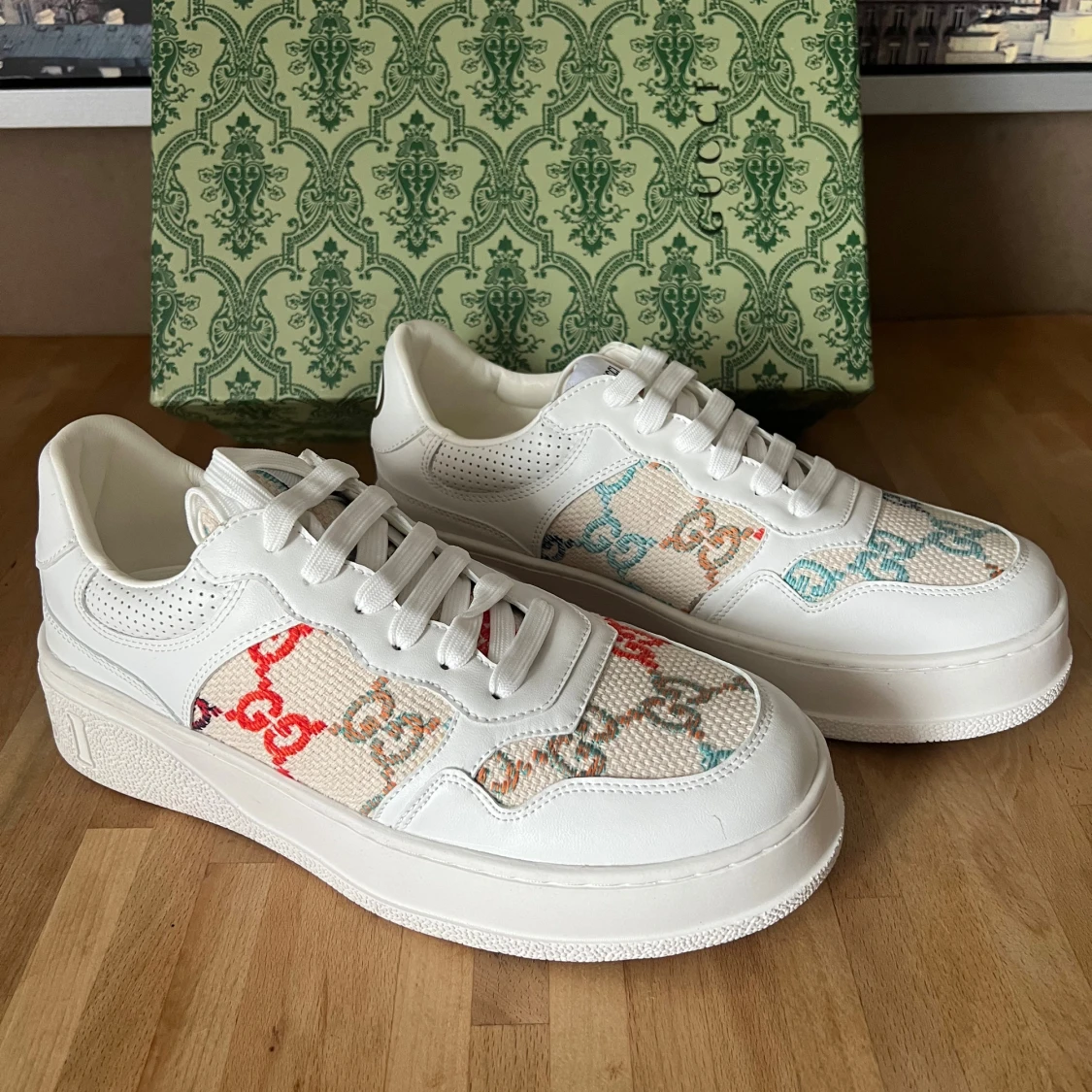 Snygga vita sneakers från Gucci med färgglada GG-loggor i rött, blått, orange och turkost på canvaspartier. Skorna har detaljer i vitt skinn, snörning och guldigt GG-tryck på hälen. Tjock sula med präglad GUCCI-text och GG-mönster undertill. Perfekt statement-piece för din outfit.